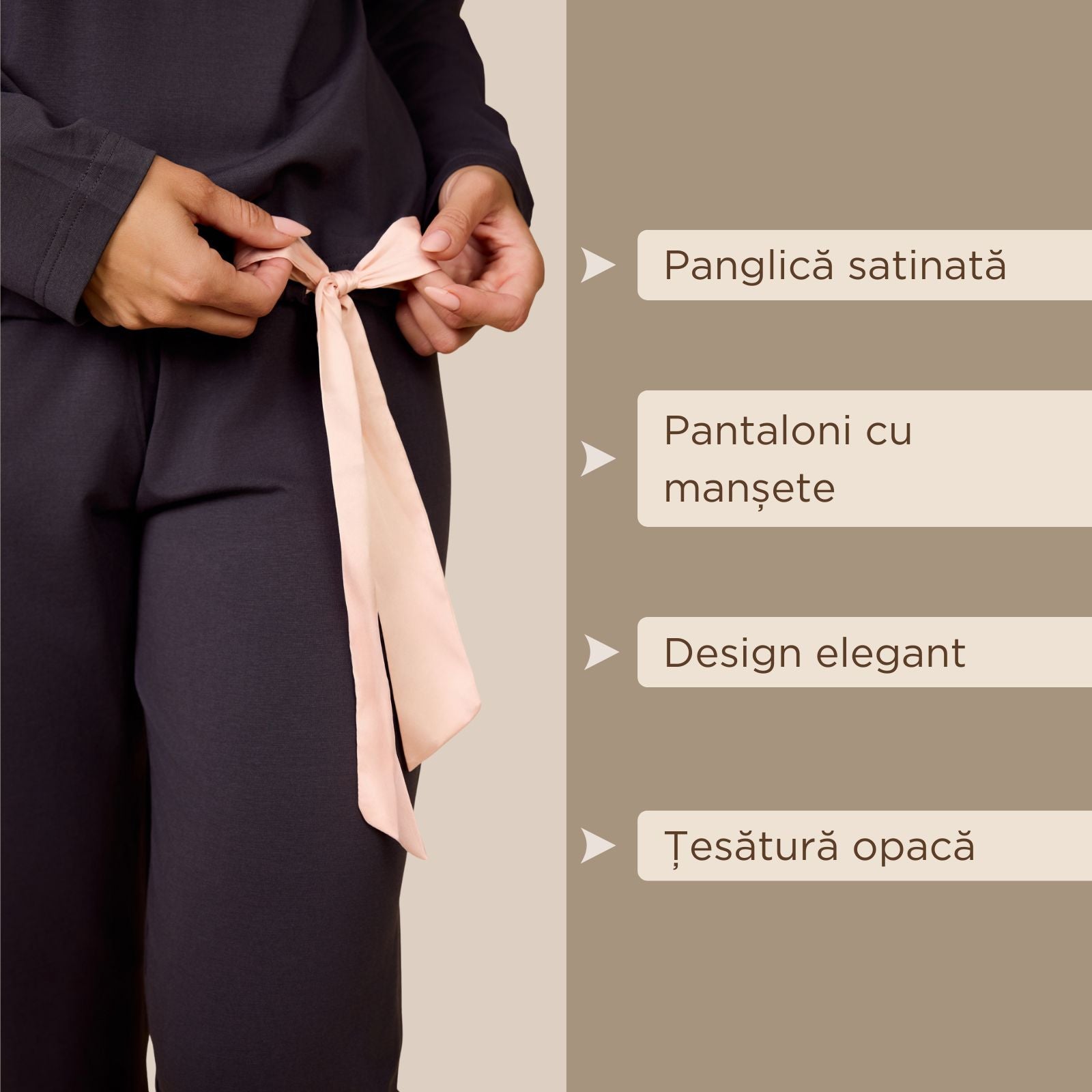 • Pantaloni lungi comozi, cu talie elastică și manșete moi