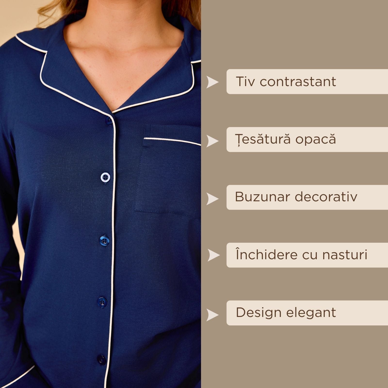 - Bluză tip cămașă cu decolteu în V, închidere cu nasturi și buzunar la piept