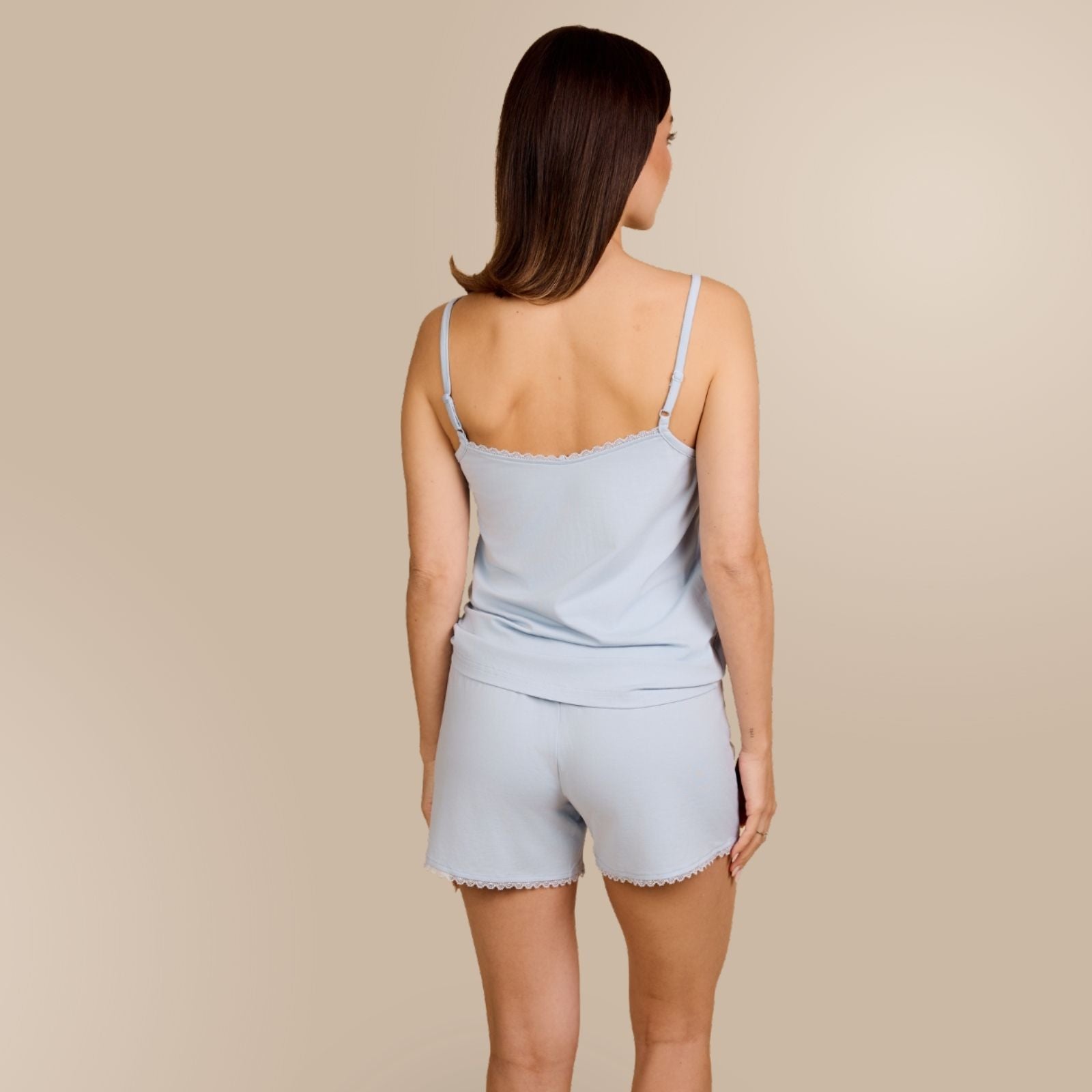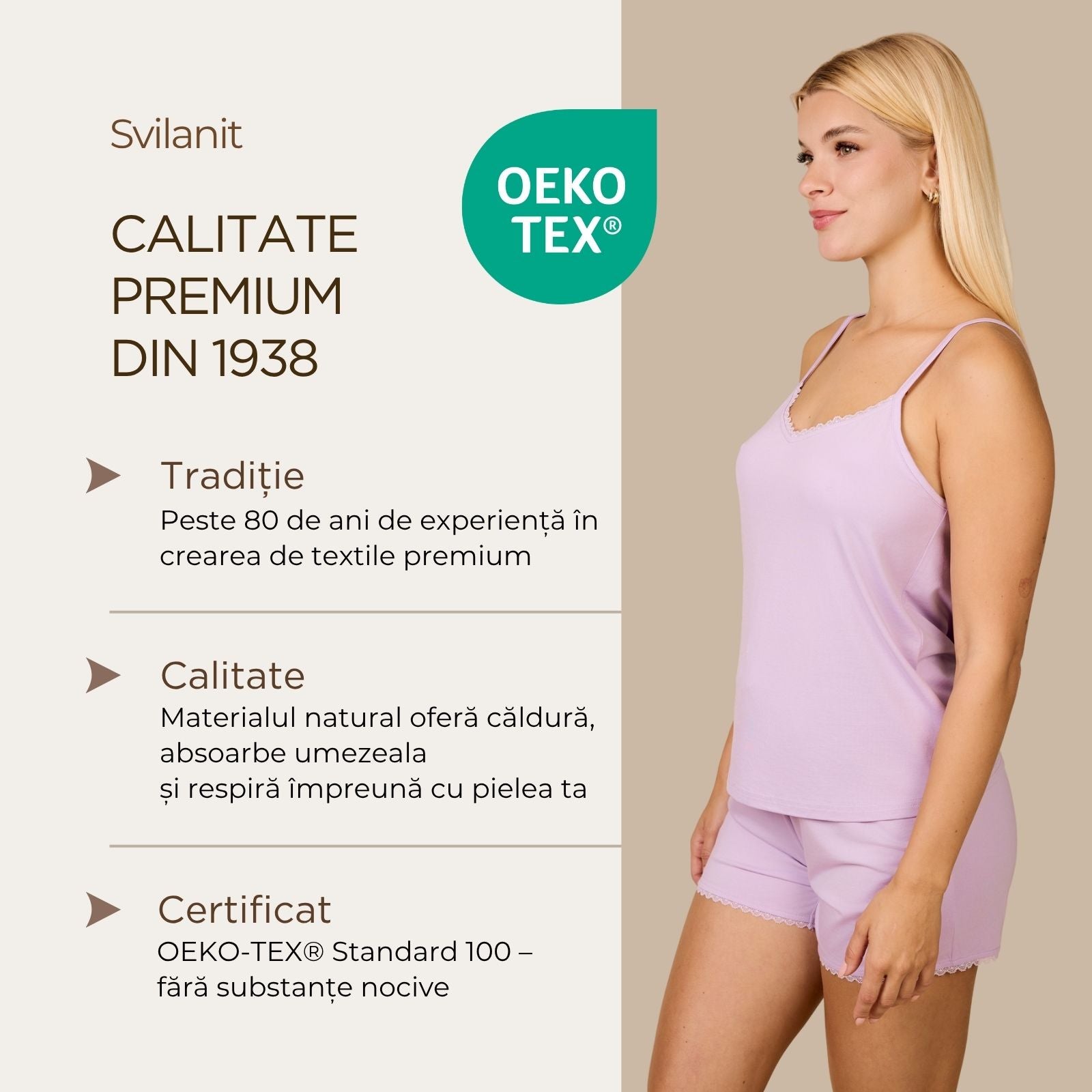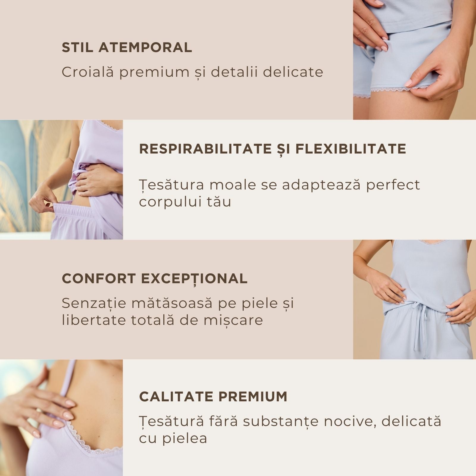 - Breteluțe delicate și dantelă rafinată pe decolteu și tivul pantalonilor scurți