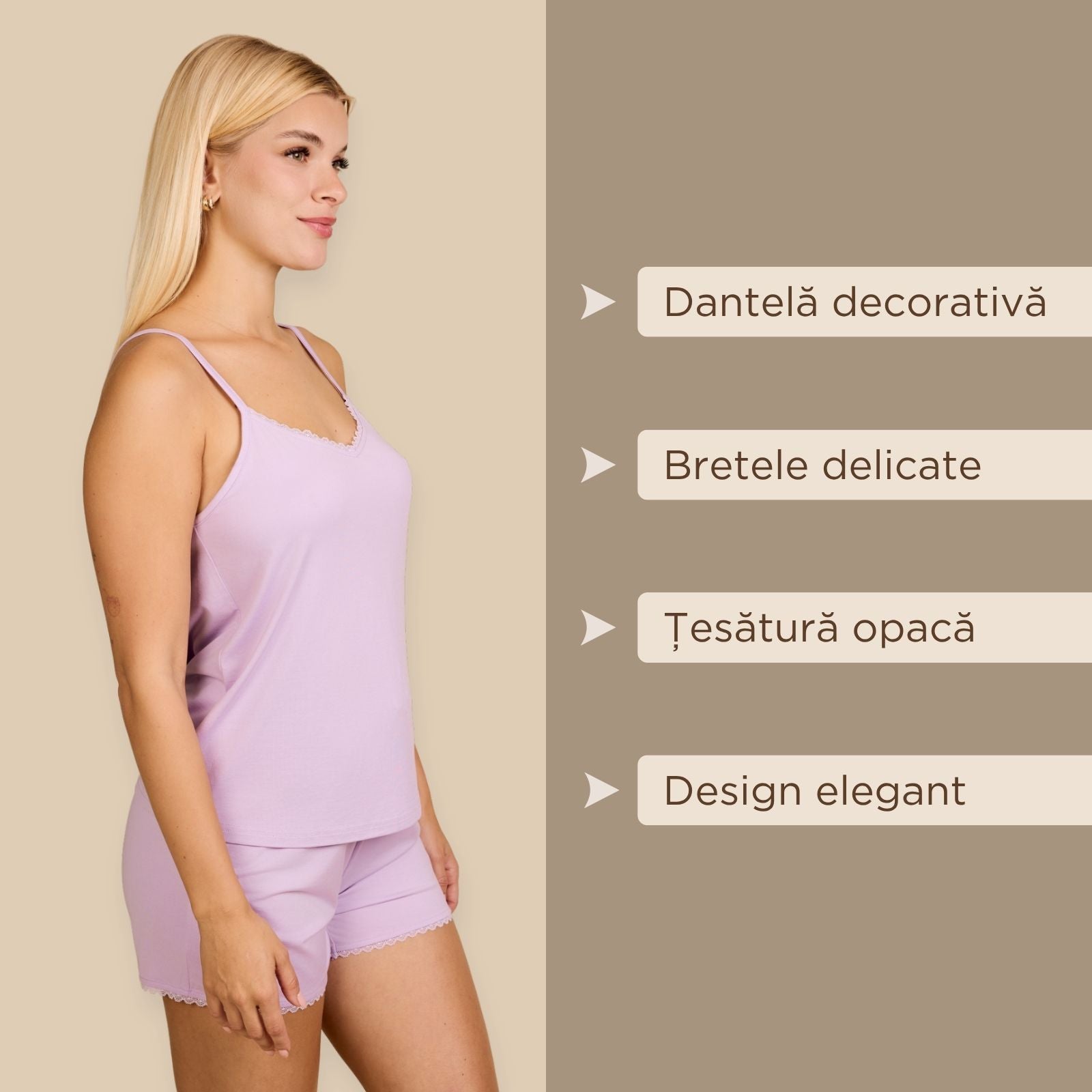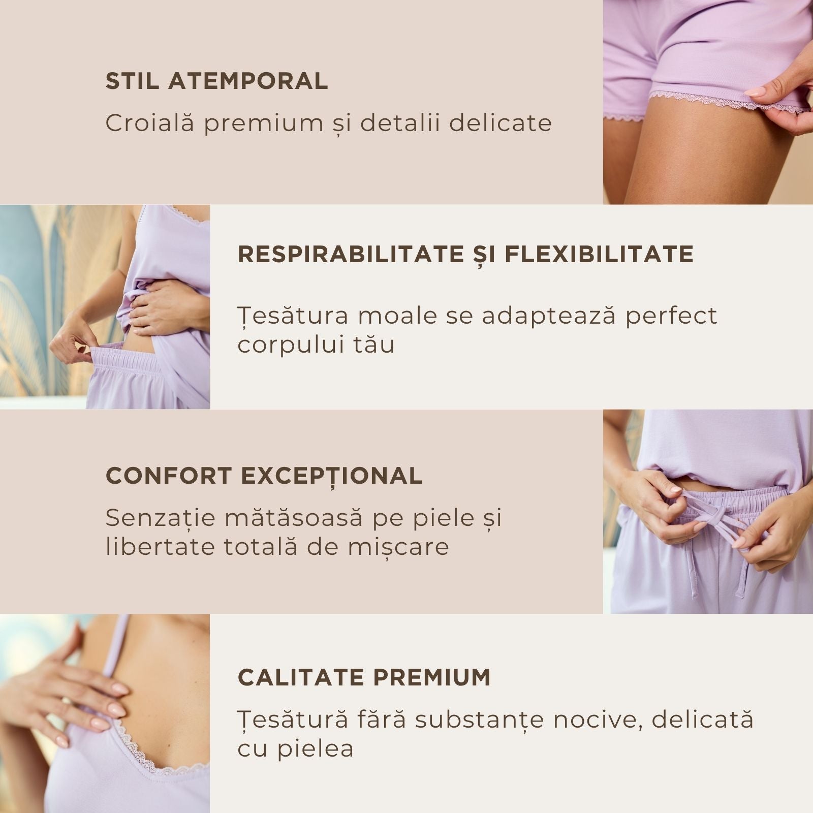 - Breteluțe delicate și dantelă rafinată pe decolteu și tivul pantalonilor scurți