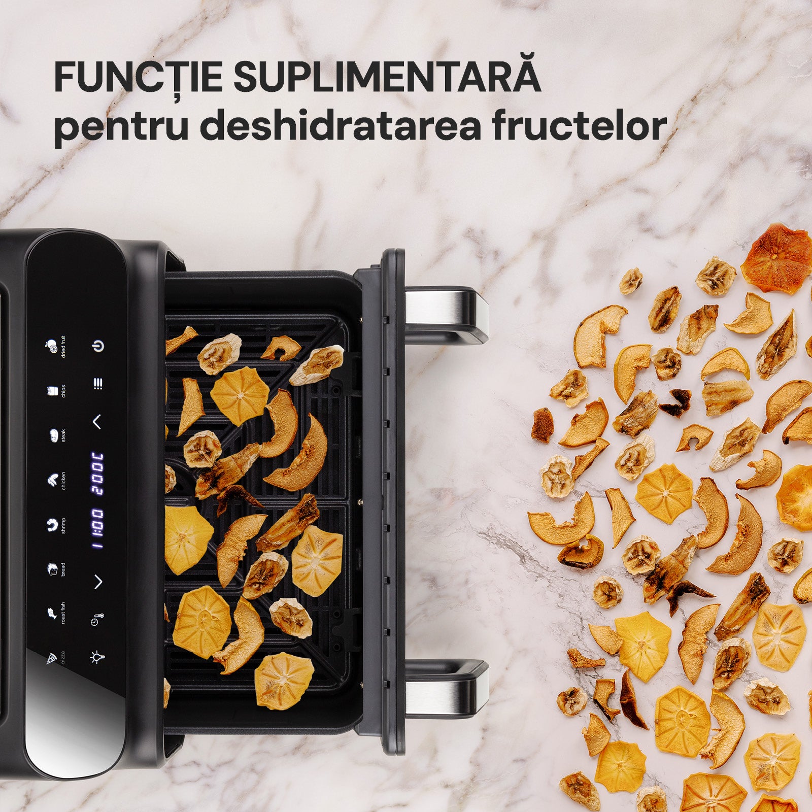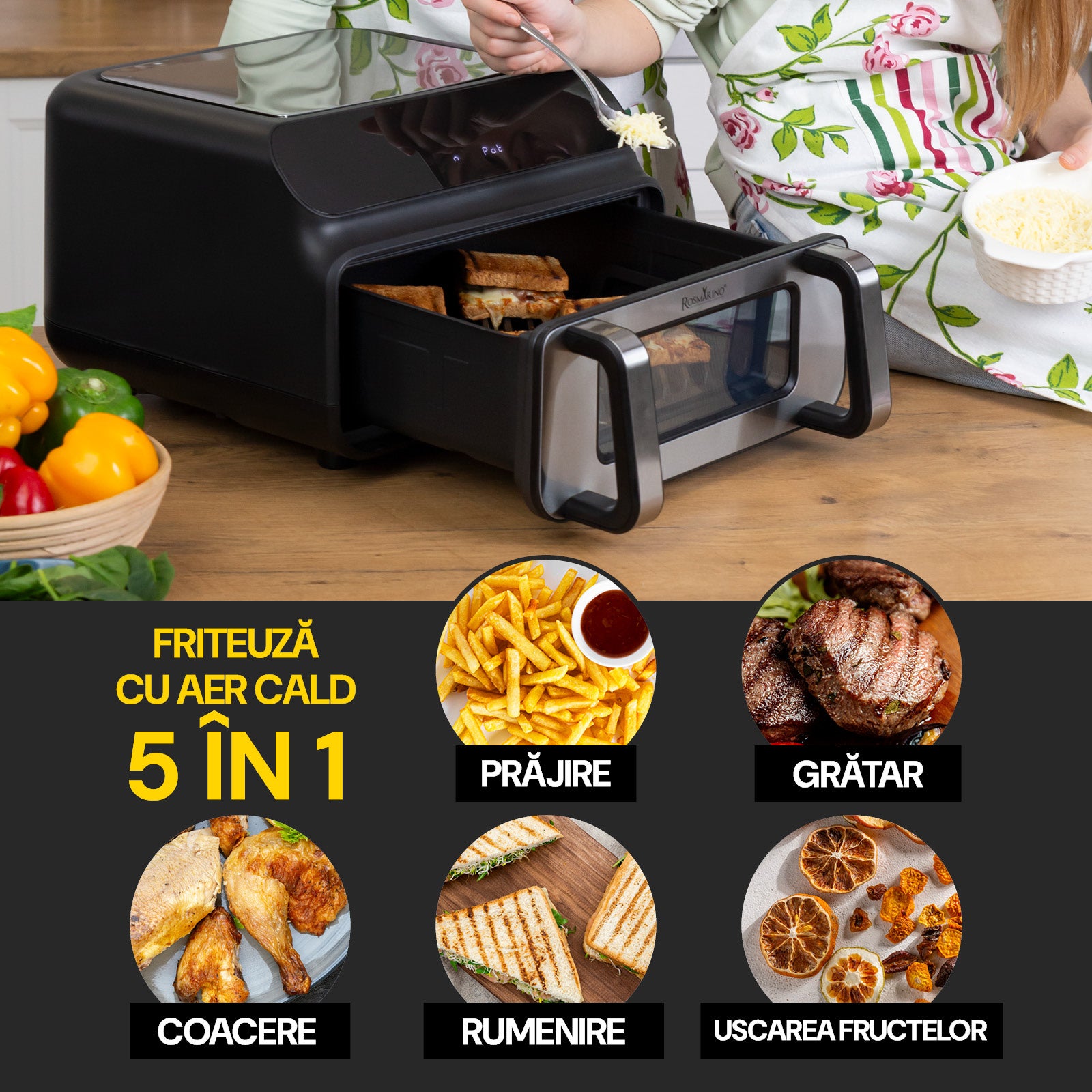 - 5 funcții în 1: prăjire, grătar, coacere, deshidratare, rumenire.