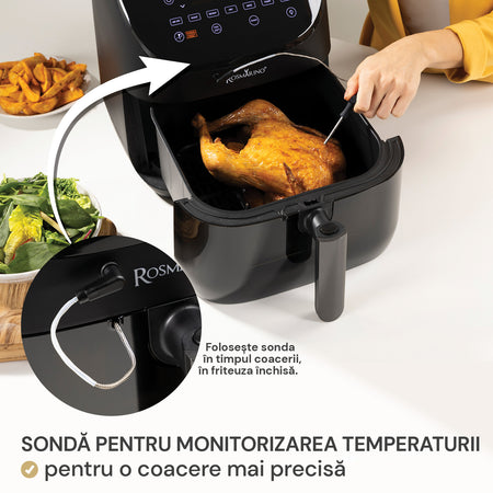 - Senzorul de temperatură integrat monitorizează automat temperatura internă a cărnii pentru preparate perfect gătite.