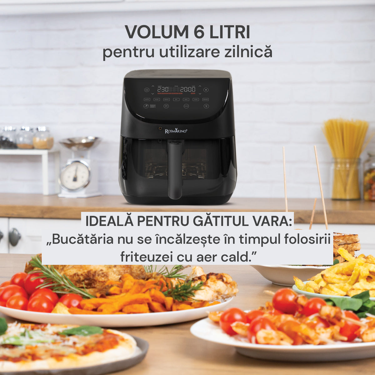 Uită de prepararea îndelungată a prânzului cu mai multe oale și de așteptarea preîncălzirii cuptorului. Coșul spațios de 6 litri este suficient de mare pentru a pregăti o masă pentru întreaga familie. Comparativ cu un cuptor, mâncarea este gata mai repede, iar friteuza poate fi folosită și pentru reîncălzirea preparatelor.