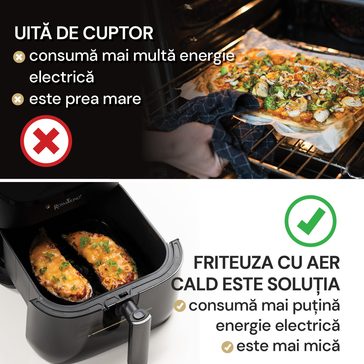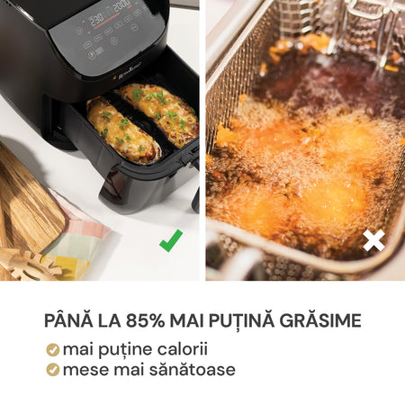 - Air fryer-ul permite prepararea alimentelor cu până la 85% mai puțină grăsime comparativ cu prăjirea tradițională.