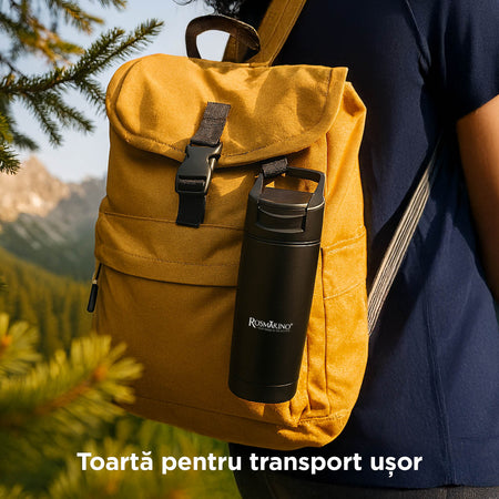 - Cană termică din oțel inoxidabil care menține băuturile reci sau calde ore întregi.
