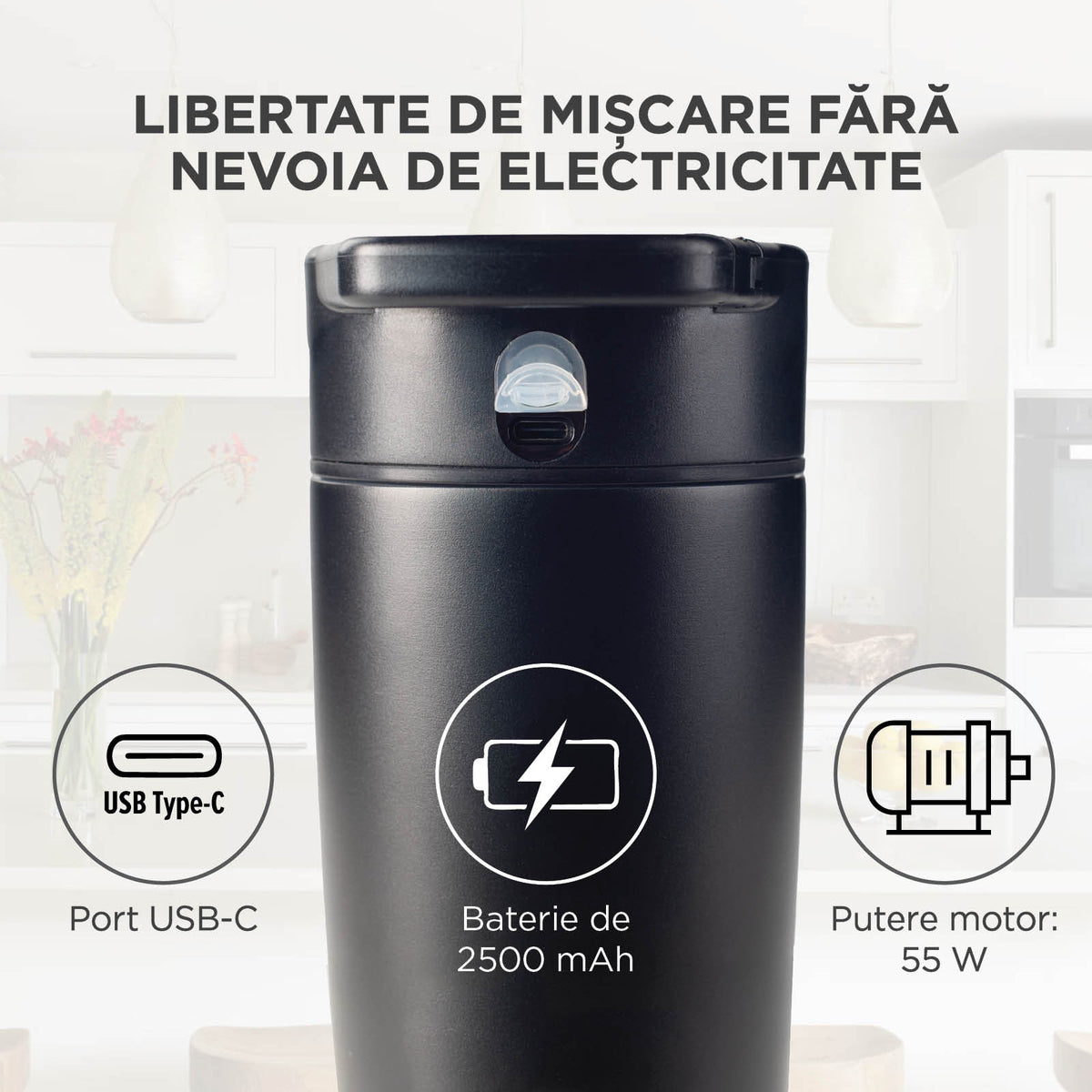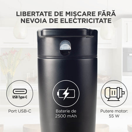 - Bateria de 2500 mAh îți permite să prepari băuturi sănătoase oriunde te-ai afla.