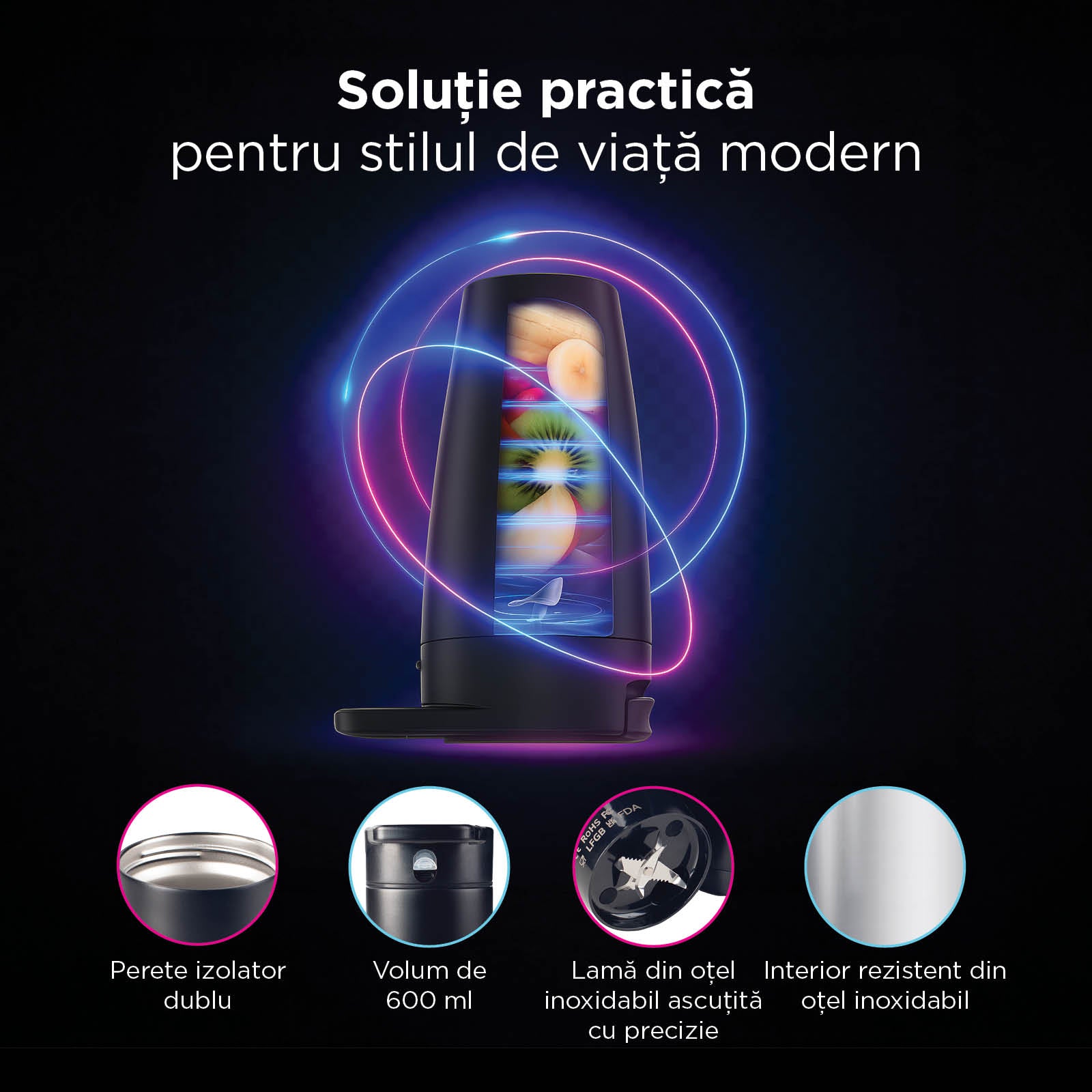 - Blender unic cu funcție termică ce menține băuturile reci sau calde ore întregi.