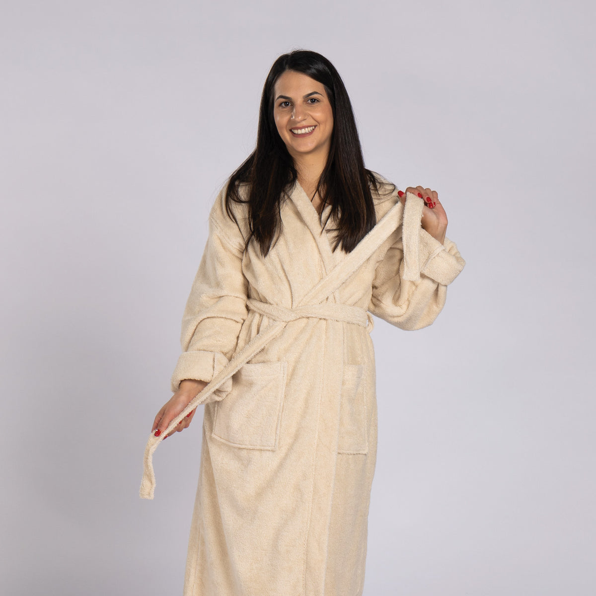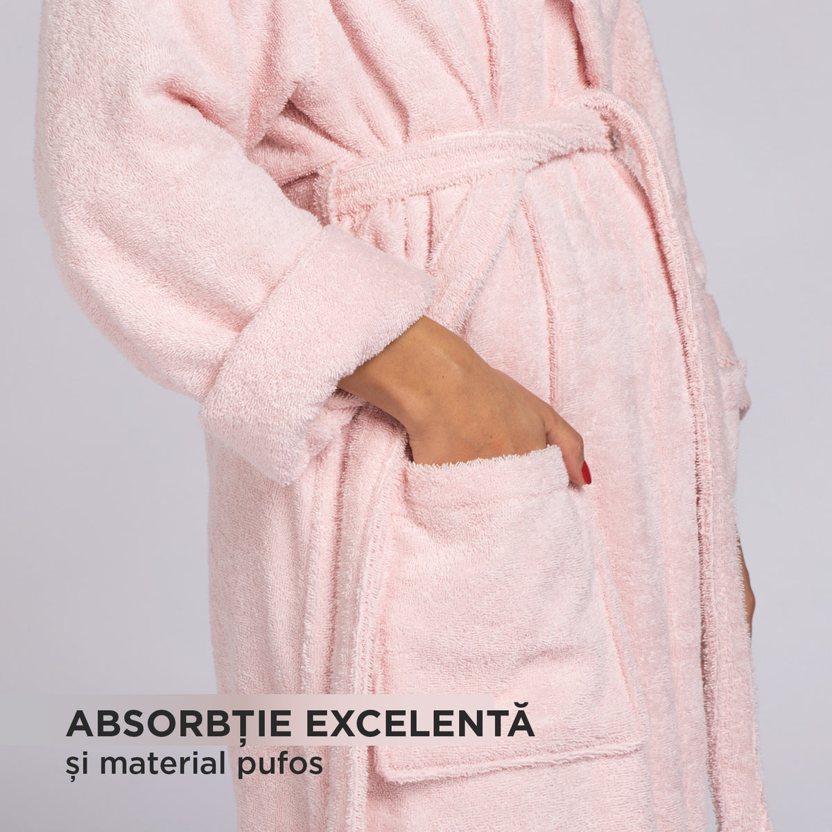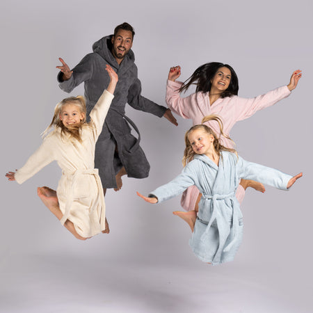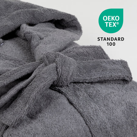 Halatul Infinity este realizat din 100% bumbac și are certificarea OEKO-TEX, care garantează faptul că țesătura nu conține substanțe dăunătoare. După baie sau înot, te poți înfășura în acest halat fără a-ți face griji cu privire la iritațiile pielii.