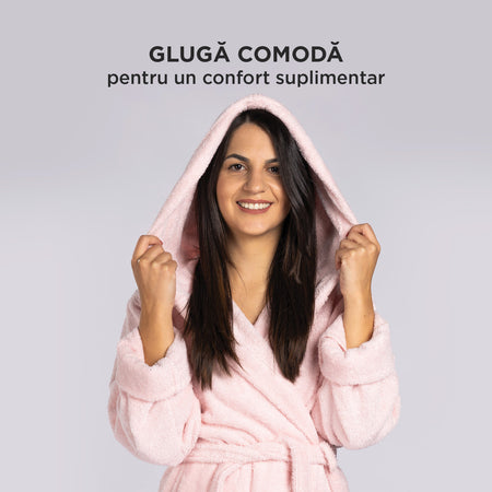 Halatul include o glugă practică pentru a acoperi părul ud și a-l proteja de frig. Cele două buzunare mari sunt perfecte pentru a-ți încălzi mâinile sau pentru a depozita lucruri mici esențiale.