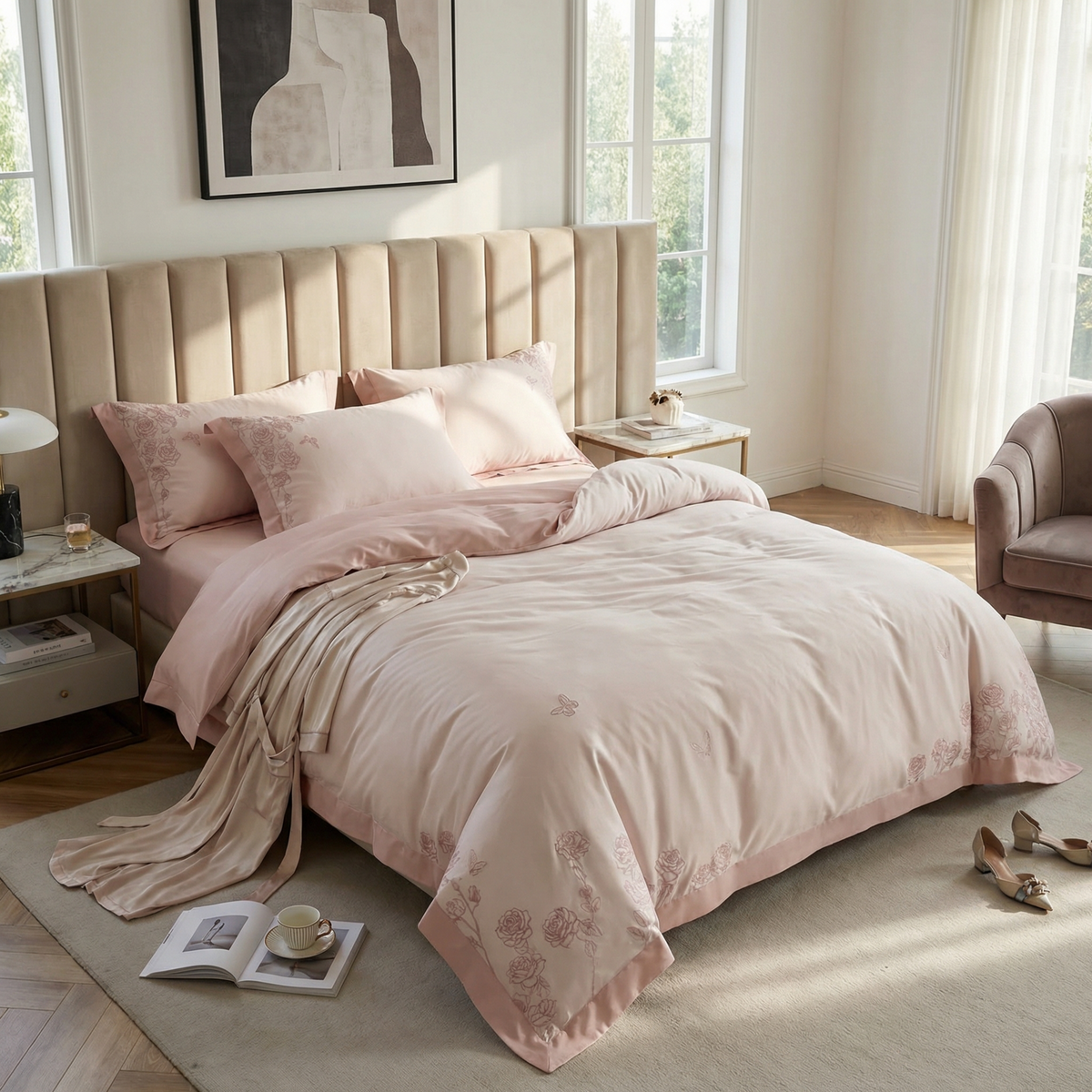 - Lenjerie de pat brodată de primă clasă, realizată 100% din bumbac egiptean de calitate.
