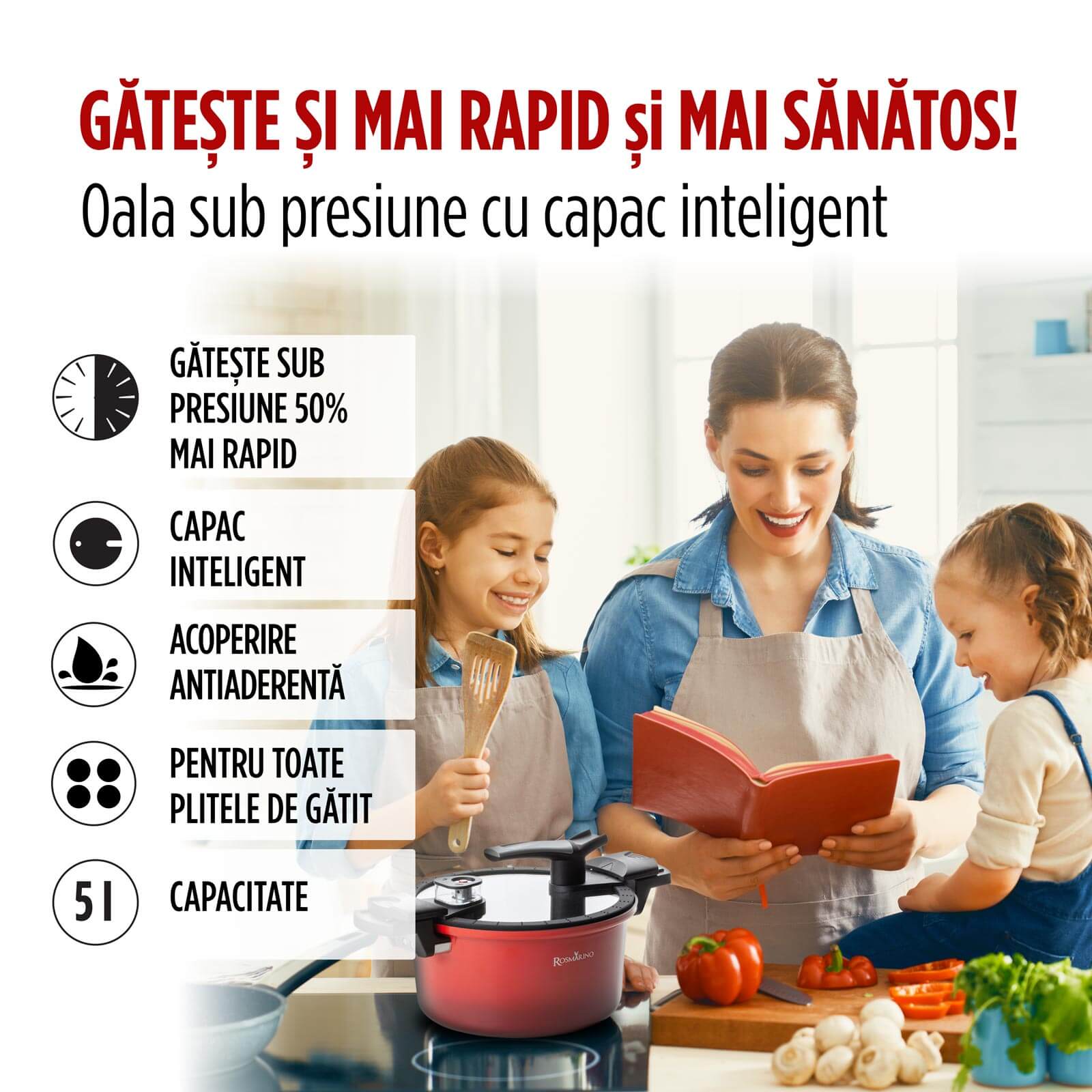 Am dezvoltat oala sub presiune joasă Rosmarino, un produs de înaltă calitate, care aduce preparatele la forma lor desăvârșită într-un timp considerabil mai scurt. Reduce timpul de gătit la jumătate și permite economisirea a până la 70% din consumul de energie, comparativ cu vasele de gătit convenționale. Învelișul antiaderent facilitează gătitul și contribuie la reducerea cantității de grăsimi utilizate.