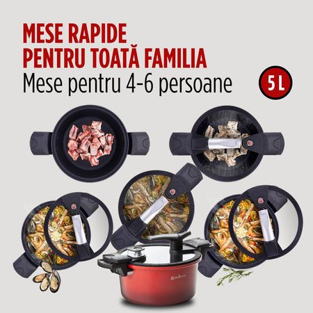 - Volumul generos de 5 litri este ideal pentru prepararea meselor de familie într-o singură oală.