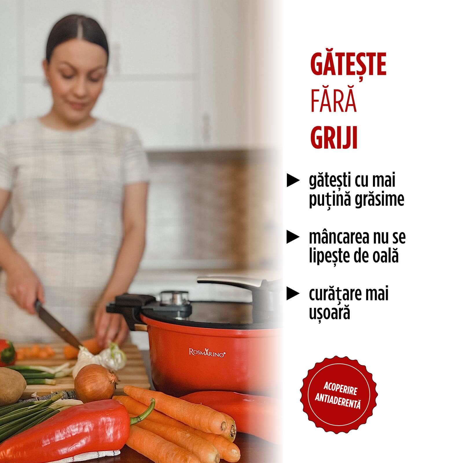 - Acoperirea antiaderentă facilitează gătitul și reduce necesarul de grăsimi.