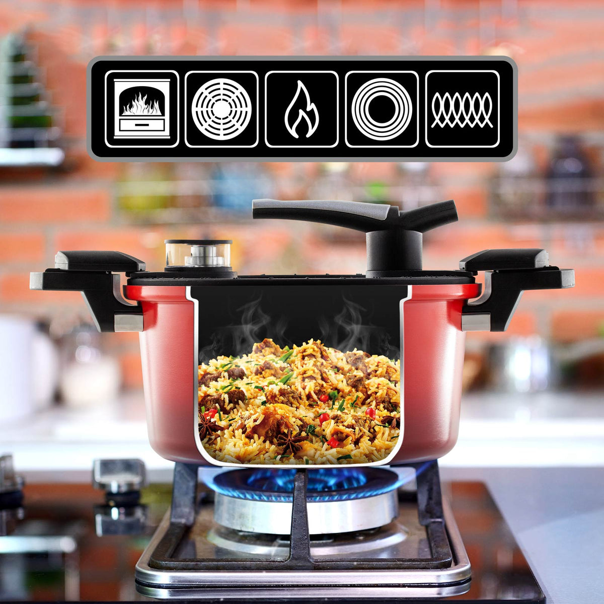 Oala poate fi utilizată pe toate tipurile de plite, inclusiv pe cele cu inducție. Datorită proprietăților conductoare excepționale ale materialelor, nu este necesară supraîncălzirea pentru a obține o eficiență termică optimă.