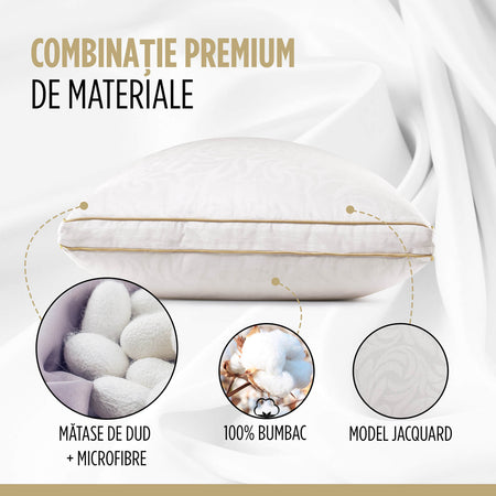 - Mătasea de dud, de o calitate excepțională, prezentă în husa pernei, oferă în fiecare seară un control eficient al temperaturii și o respirabilitate excelentă.