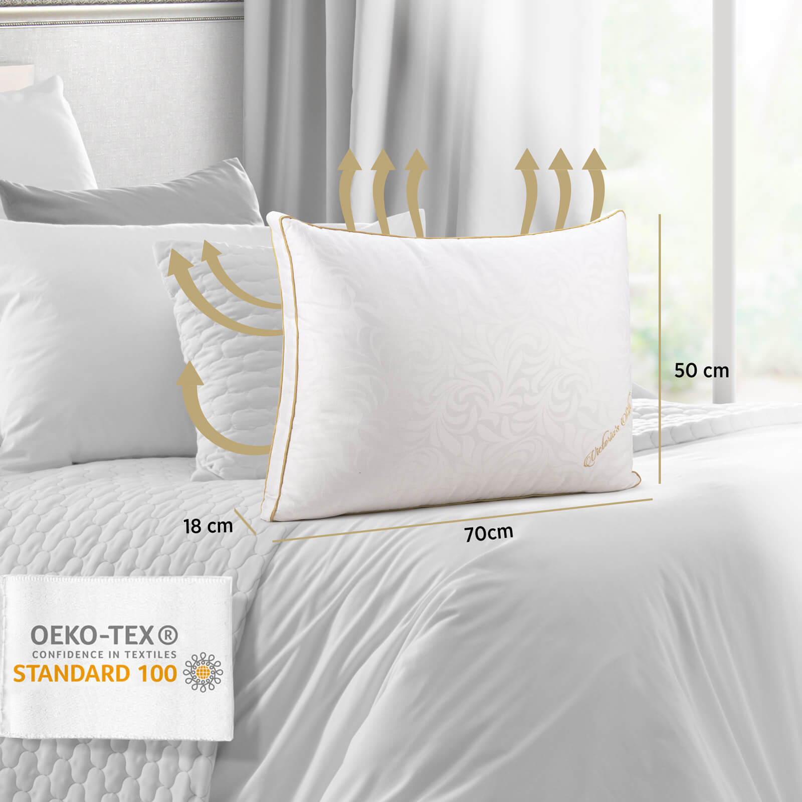 Victoria's Silk menține fiecare parte a gâtului în poziția corectă pe tot parcursul somnului. Oferă cel mai bun sprijin cu puncte de presiune sub gât, umeri și cap, astfel încât vertebrele să fie întotdeauna aliniate corect. Asta înseamnă mai puține dureri de gât și nopți mai liniștite.