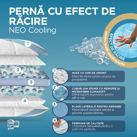Husa inovatoare cu efect de răcire conține fibre cu ioni de argint cu efect antibacterian. Proprietățile acestora împiedică dezvoltarea bacteriilor, acarienilor și mucegaiului. Prin urmare, perna NEO Cooling este alegerea ideală pentru persoanele alergice și pentru cele cu pielea sensibilă, deoarece elimină alergenii din mediul de somn.