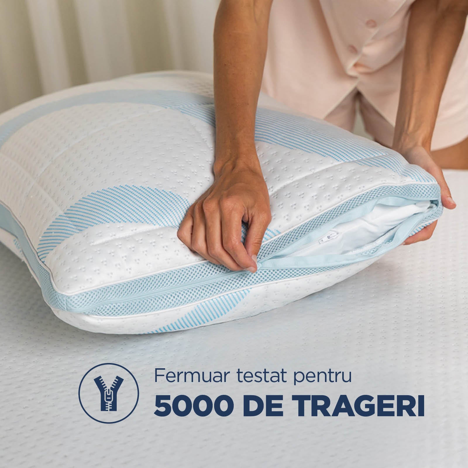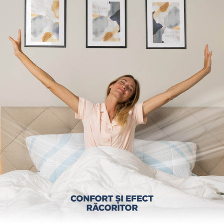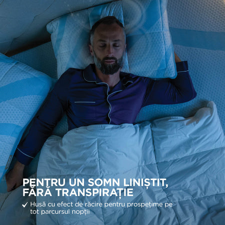 - Husă inovatoare cu efect de răcire, care reglează temperatura și se adaptează corpului, ajutând la prevenirea transpirației în nopțile fierbinți.