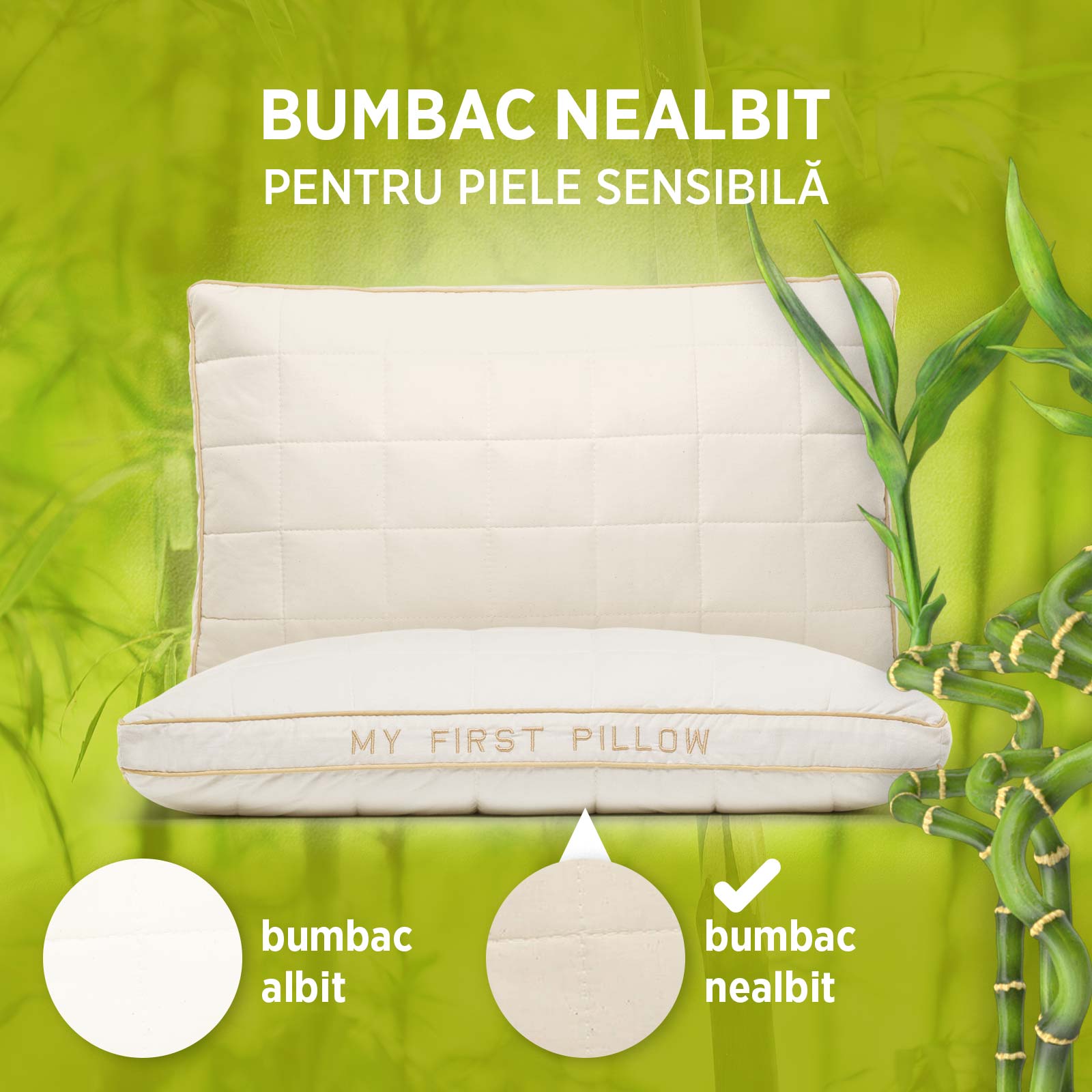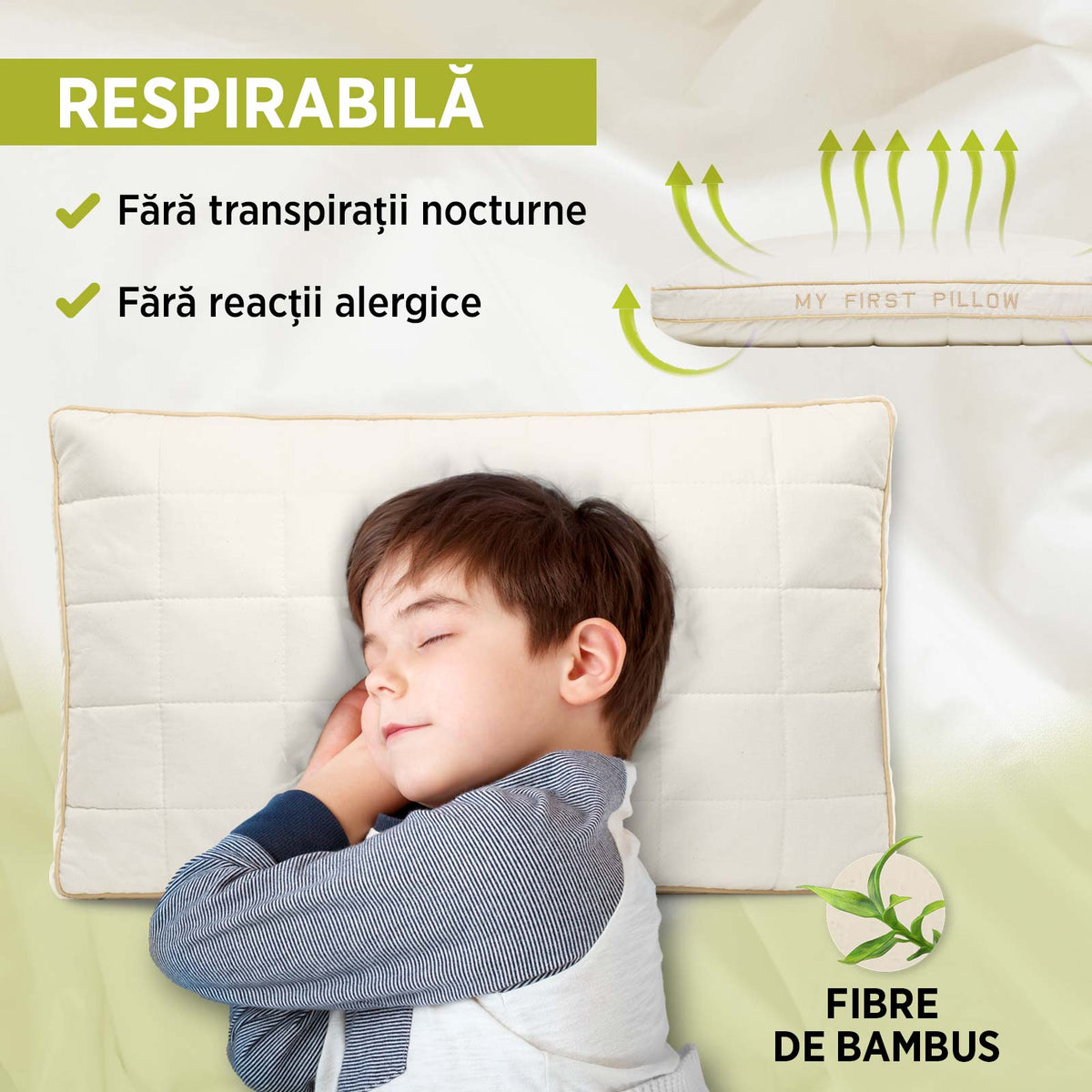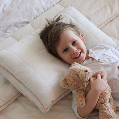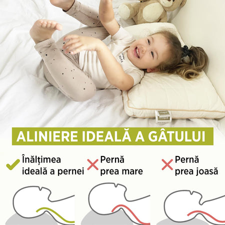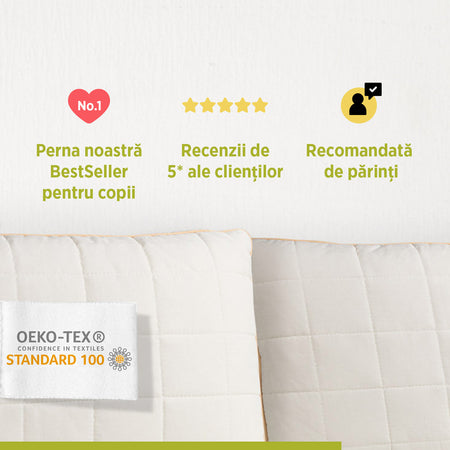 Perna pentru copii My First Pillow este cea mai vândută dintre pernele noastre pentru cei mici și promite un somn liniștit și odihnitor. Oferă susținere excelentă pentru coloana și gâtul copilului, indiferent de poziția în care doarme. Este potrivită pentru copiii de peste 1 an, dar și pentru cei puțin mai mari, datorită înălțimii și fermității reglabile. Husa din bumbac nealbit și fibre naturale de bambus a fost creată special pentru pielea delicată a copiilor.