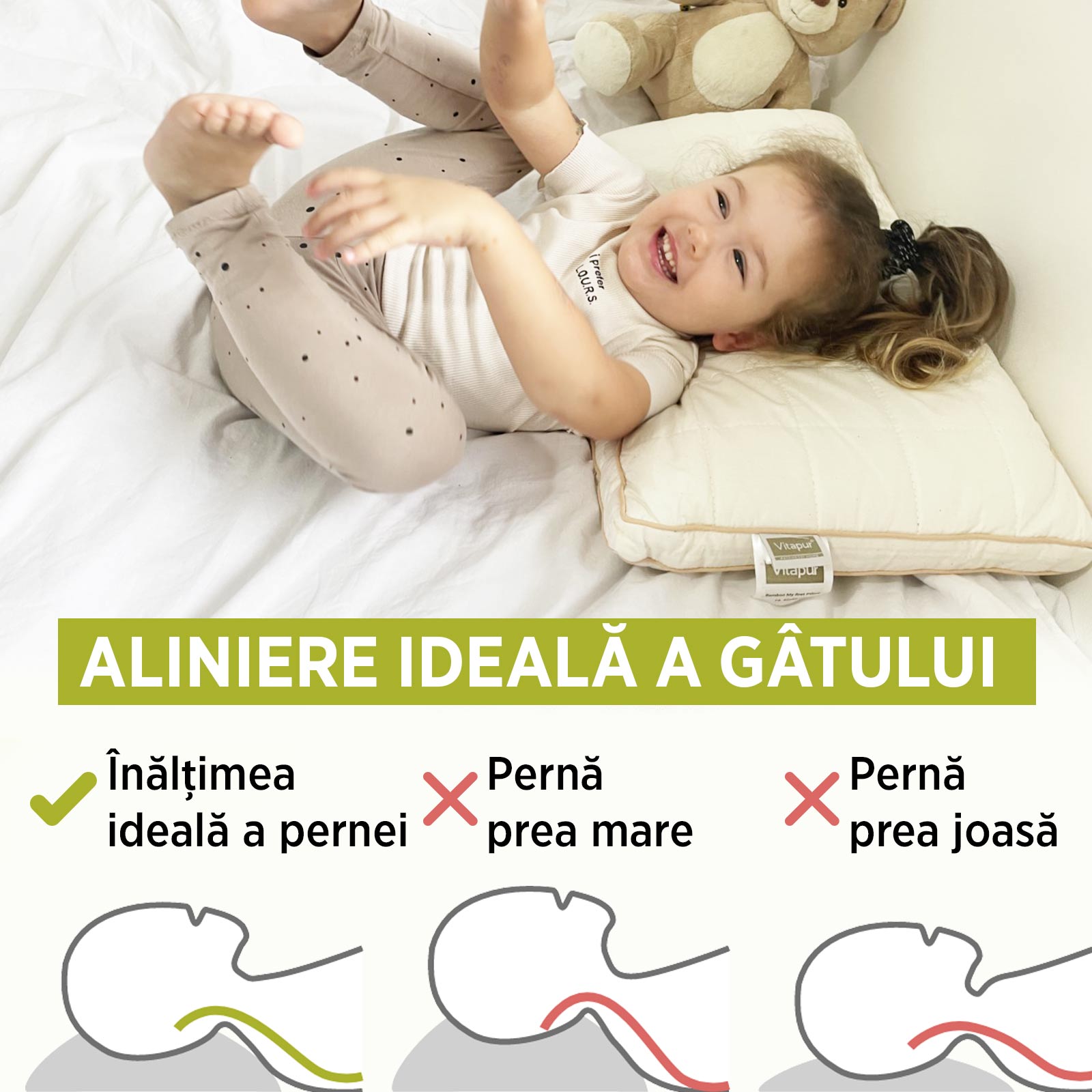 My First Pillow menține coloana vertebrală a copilului mereu într-o poziție corectă, indiferent de poziția de dormit. Oferă cel mai bun sprijin punctelor de presiune de sub umeri, gât și cap pentru vertebre cât mai corect aliniate.