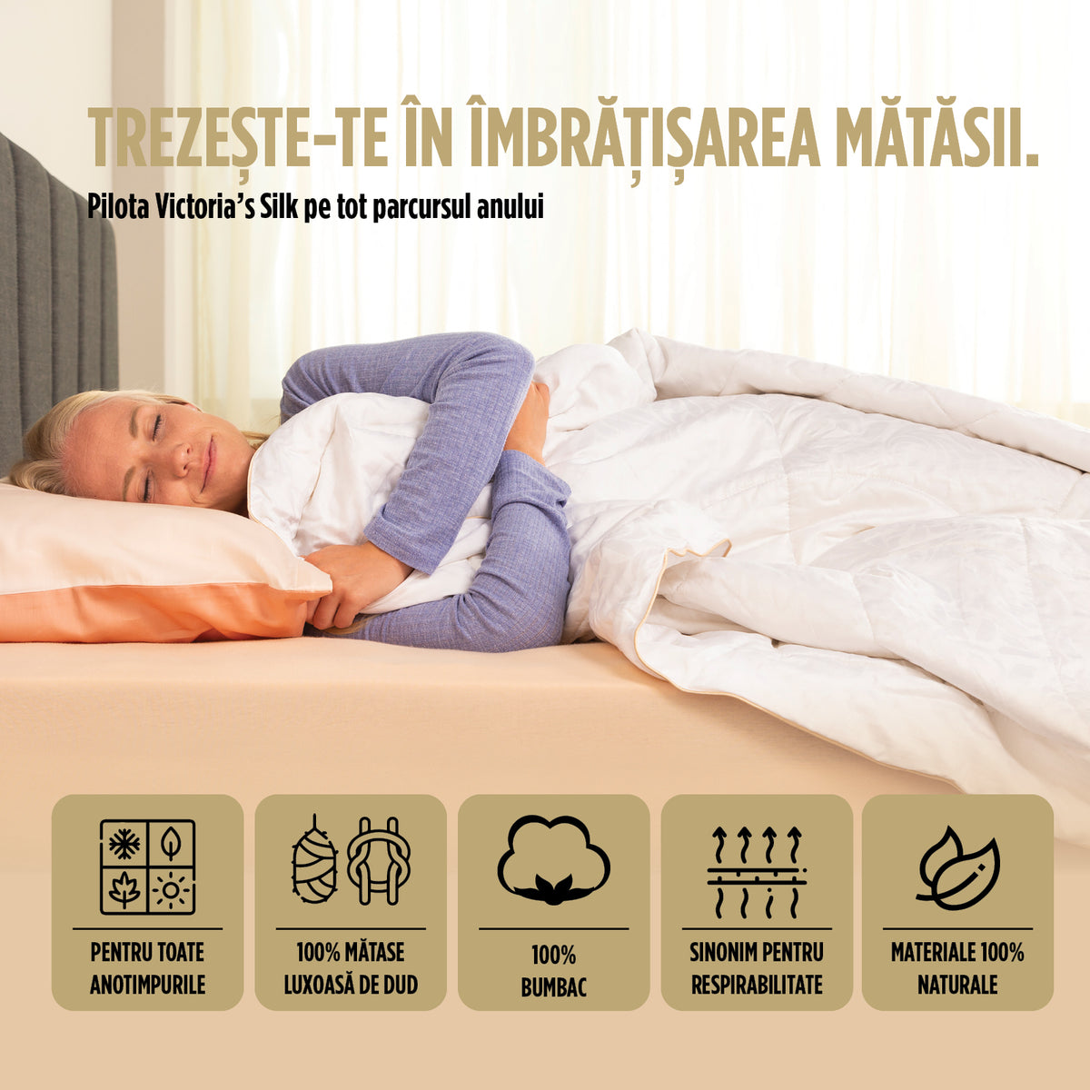 Pilota de mătase este cel mai bun regulator de căldură. Vă ține cald iarna și în zilele de tranziție, dar vara doar vă menține temperatura corpului, astfel încât nu vă încălziți niciodată prea tare. În același timp, îți îmbrățișează ușor corpul și reglează umiditatea pe care corpul tău o degajă în fiecare noapte. Dacă vă doriți doar 1 plapumă pentru tot anul, aceasta este alegerea potrivită pentru tine.