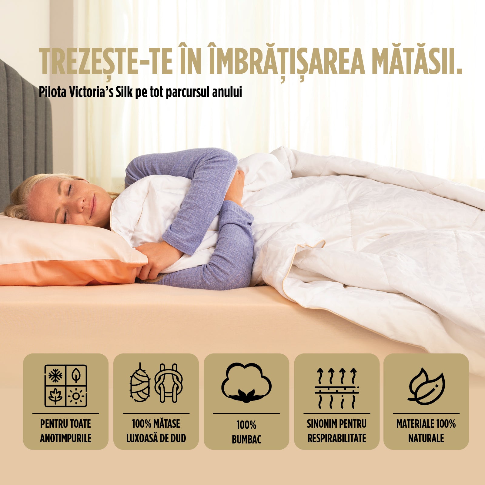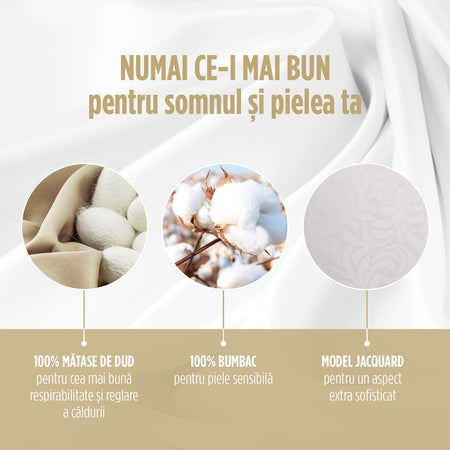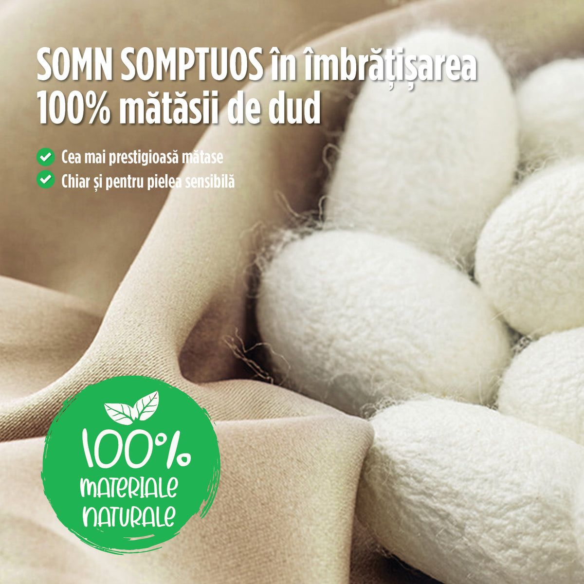 Mătasea de mure are o capacitate naturală de a regla căldura și umiditatea, fiind în același timp bună pentru bunăstarea și pielea ta. Astfel, somnul tău va fi mai respirabil și întotdeauna suficient de cald. Fiind cel mai pur material natural, mătasea nu vă expune la substanțe chimice, deoarece este tratată într-un mod complet natural, fiind potrivită pentru persoanele cu pielea sensibilă.