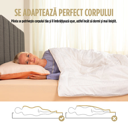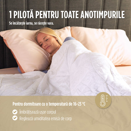 - Pilotă pentru tot anul, pentru un somn confortabil în toate anotimpurile, potrivită și pentru lunile mai calde sau pentru temperaturile din dormitor între 16-23 °C.