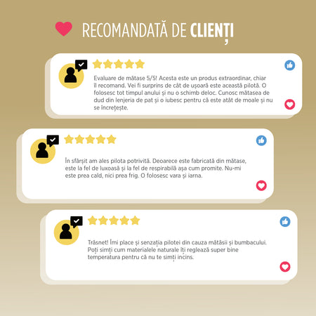 - Mătasea este un mediu extrem de neospitalier pentru germeni și acarieni, vă recomandăm curățarea uscată și aerisirea zilnică a pilotei.