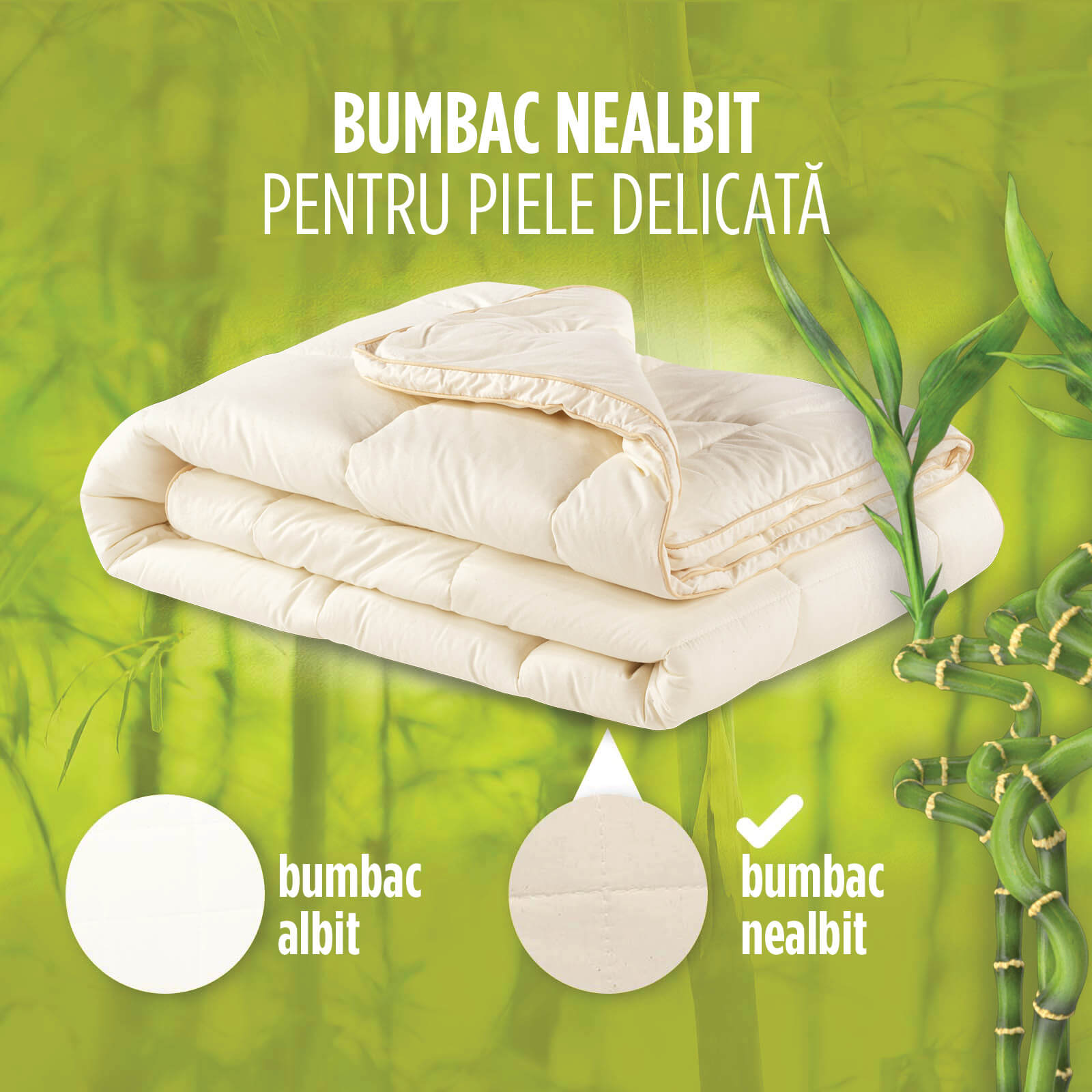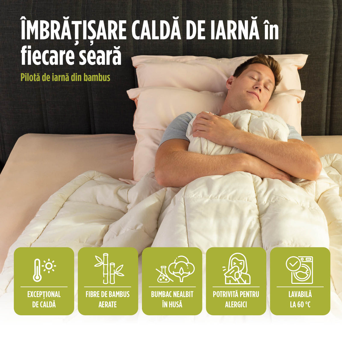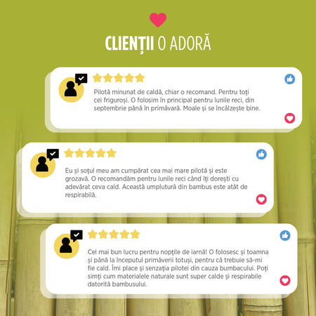 - Umplutura din bambus asigură o respirabilitate excelentă și contribuie la eliminarea naturală a excesului de umiditate.