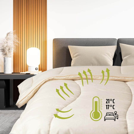 Fibrele de bambus și bumbacul nealbit din husă acționează împreună pentru a elimina în mod natural umezeala eliberată de corp în timpul somnului. Astfel, vă bucurați de o pilotă care „respiră” odată cu dumneavoastră, menținând temperatura ideală pe tot parcursul nopții. Este alegerea perfectă pentru dormitoare cu temperaturi cuprinse între 17 și 21 °C.