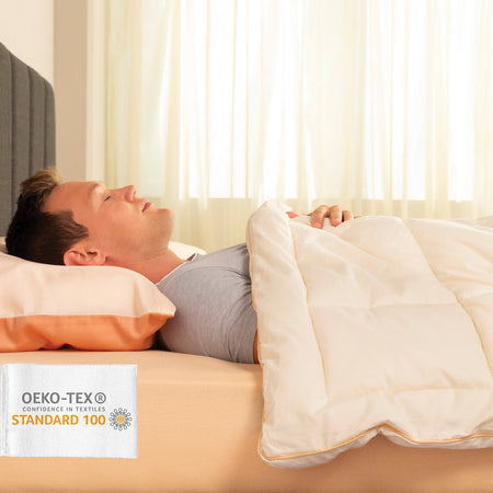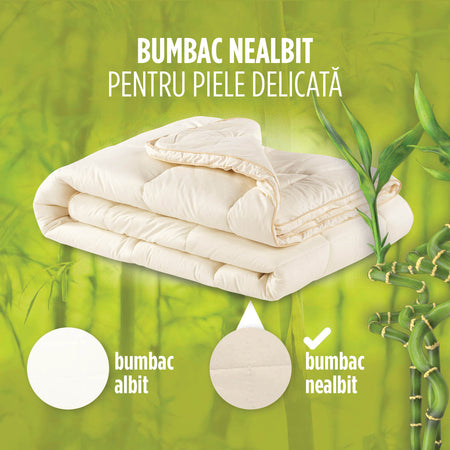 - Husa din bumbac nealbit permite contactul delicat al pielii cu materiale naturale, fiind ideală și pentru persoanele cu pielea sensibilă, astm sau alergii.