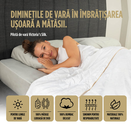Pilota de vară combină cele mai bune lucruri pe care ți le-ai putea dori pentru somnul tău. Combinația dintre mătasea de mure și bumbacul natural este perfectă pentru aceia dintre dumneavoastră care se bazează exclusiv pe materiale 100% naturale. Victoria's Silk este, de asemenea, perfectă pentru aceia dintre voi cărora le place să stea la căldură pe tot parcursul anului și care se acoperă doar noaptea cu țesături mai subțiri.