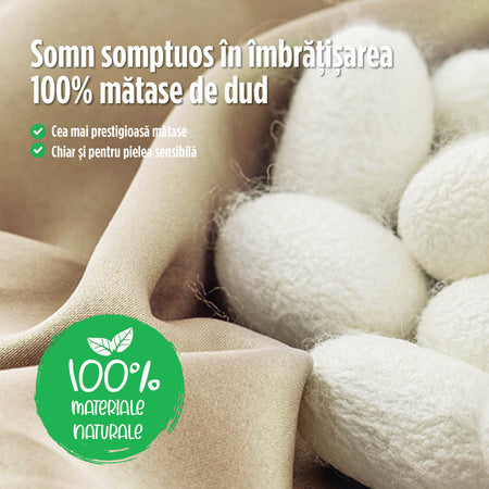 Mătasea de mure are o capacitate naturală de a regla căldura și umiditatea și este bună pentru pielea și bunăstarea ta. Acest lucru face ca somnul tău să fie mai confortabil și mai respirabil. Fiind cel mai pur material natural, mătasea nu vă expune la substanțe chimice, deoarece este tratată într-un mod complet natural, fiind potrivită pentru persoanele cu pielea sensibilă.