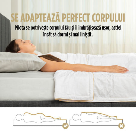 Mătasea este împachetată în mai multe straturi în umplutură, permițând o respirabilitate maximă, ceea ce face ca această pătură să fie potrivită pentru cei care transpiră excesiv în timpul somnului. Pilota vă îmbrățișează ușor corpul și nu se agață de el ca alte pilote grele.