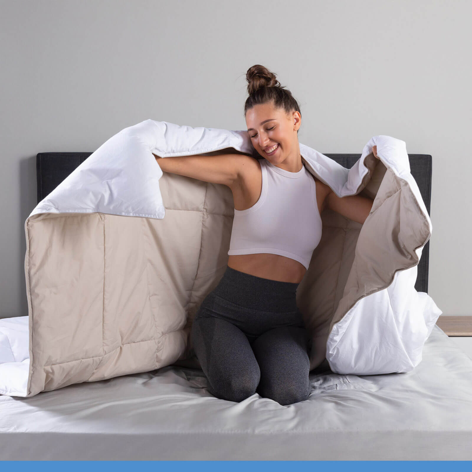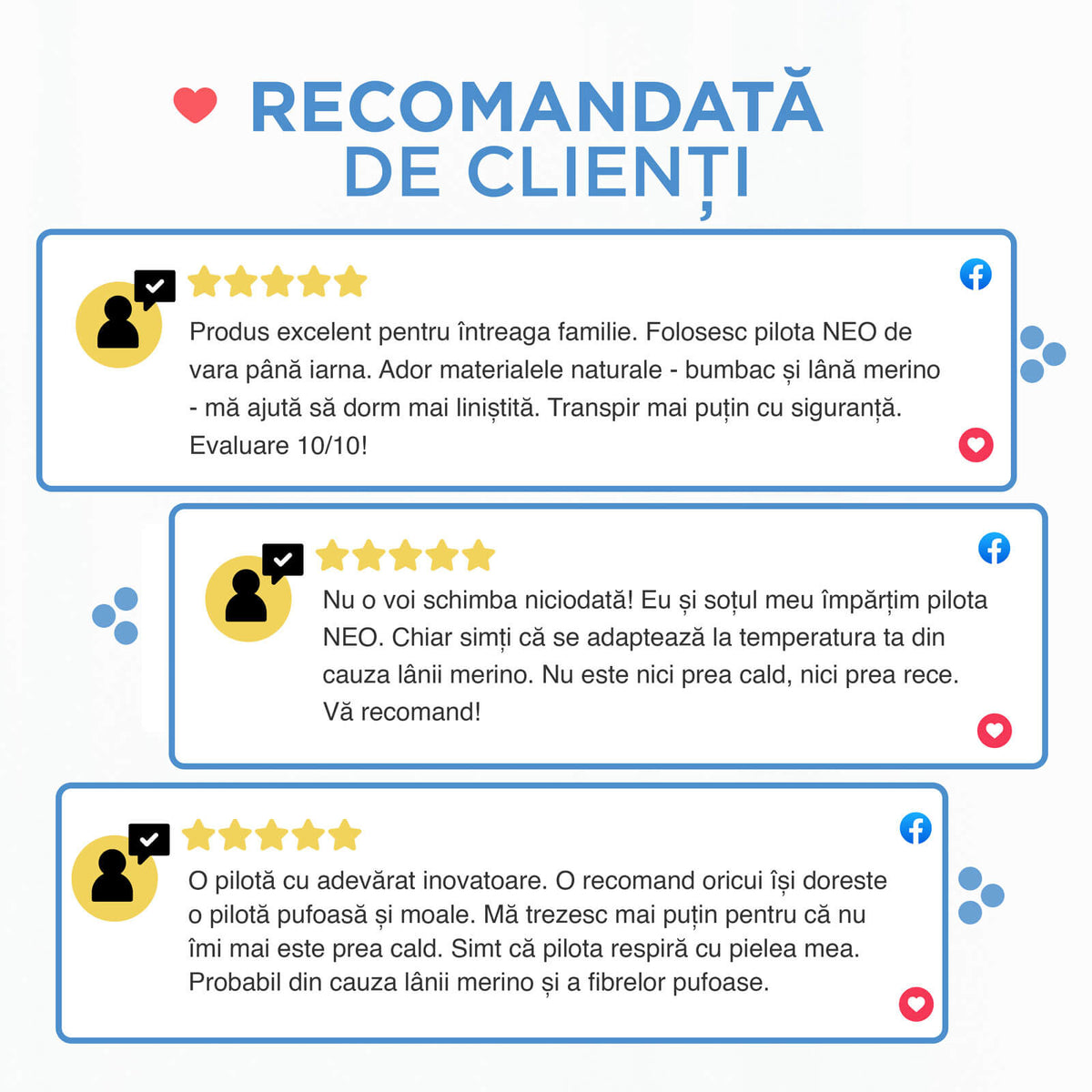 Poți întoarce pilota cu 2 straturi după cum dorești. Stratul superior din lână merino elimină perfect umezeala și menține o temperatură plăcută toată noaptea. Perfectă și în diferite anotimpuri, deoarece se răcește plăcut vara și se încălzește iarna. Stratul inferior realizat dintr-o alternativă ecologică la puf asigură că pilota este luxoasă, voluminoasă și extrem de moale la atingere. Aceste microfibre fine sunt cea mai bună alternativă la puf și oferă confortul pe care îl cunoaștem pentru acea senzație caracteristică de puf.