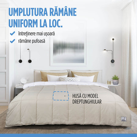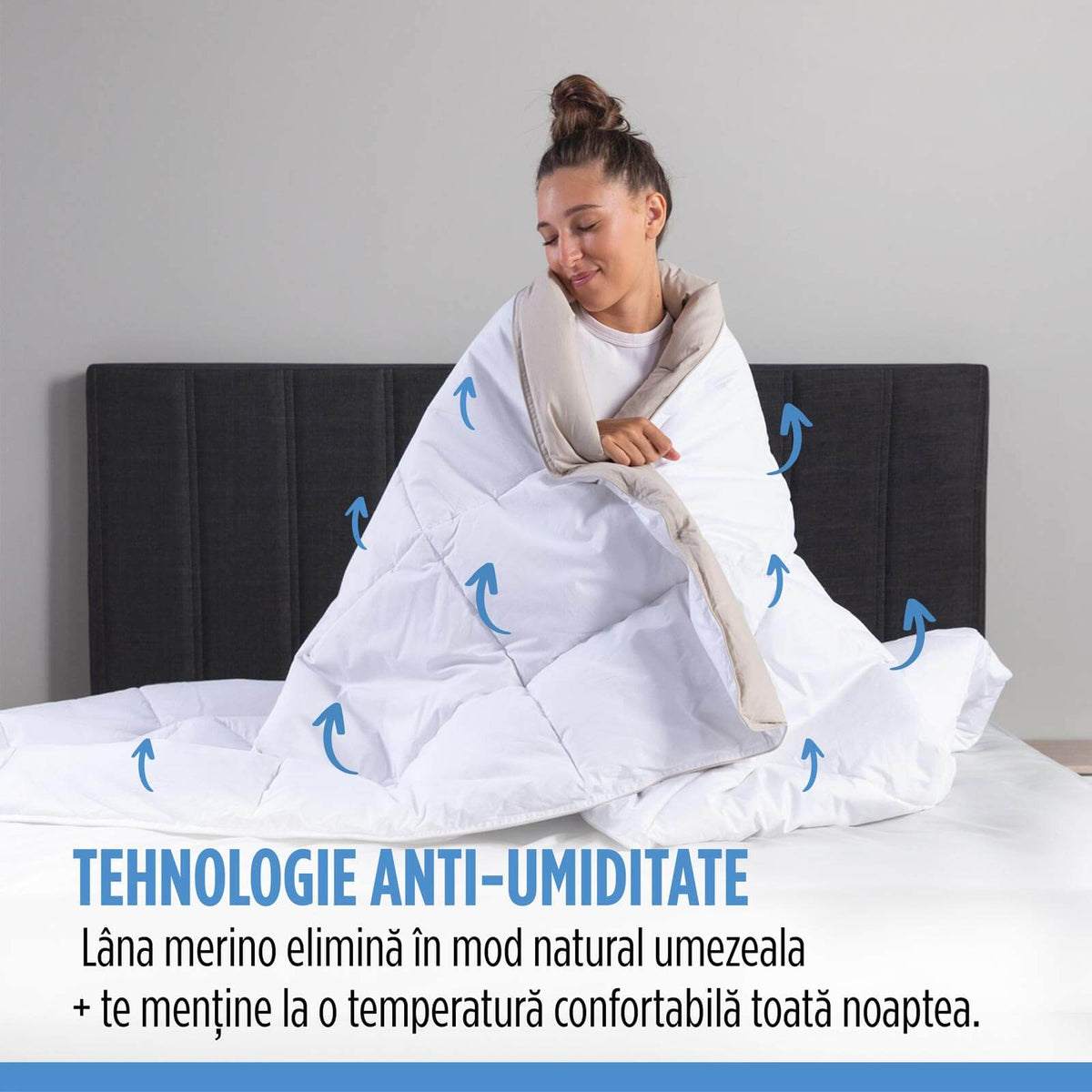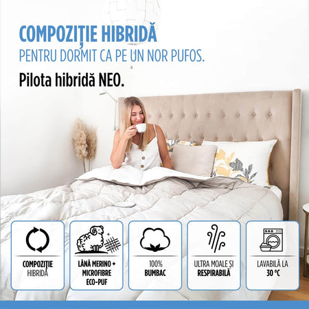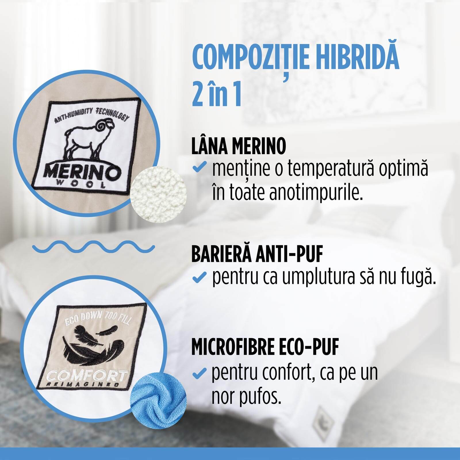 - Compoziția hibridă cu 2 straturi oferă o senzație mai bună în îmbrățișarea fiecărei nopți: stratul de lână merino oferă o reglare excelentă a temparaturii, astfel încât să nu îți niciodată prea cald, iar stratul de puf eco-alternativ oferă o senzație luxoasă de moliciune.