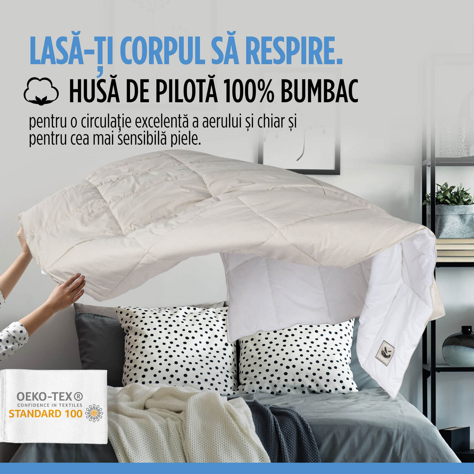 - Husa pilotei din bumbac asigură contactul pielii cu materialele naturale. Potrivită și pentru persoanele cu piele sensibilă.