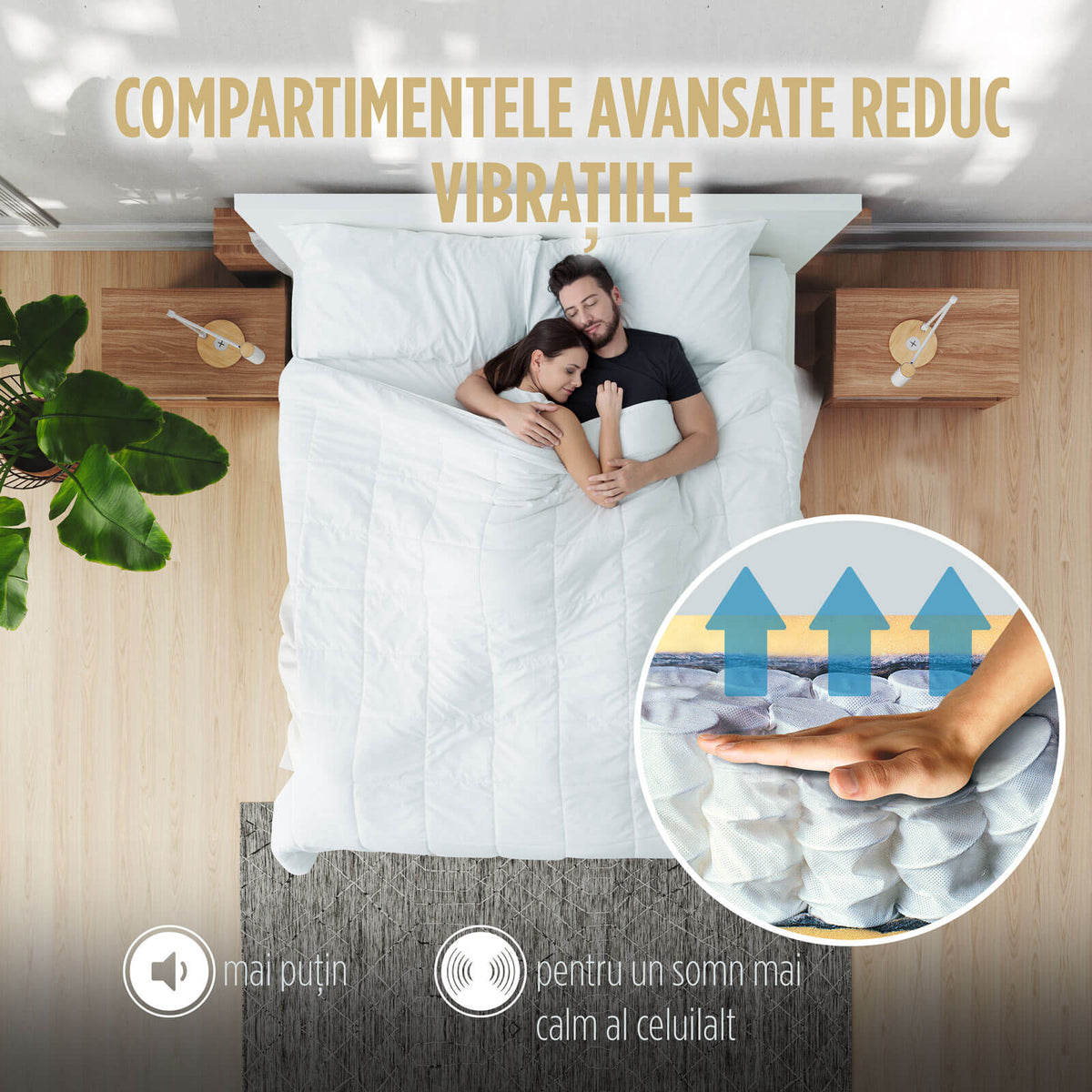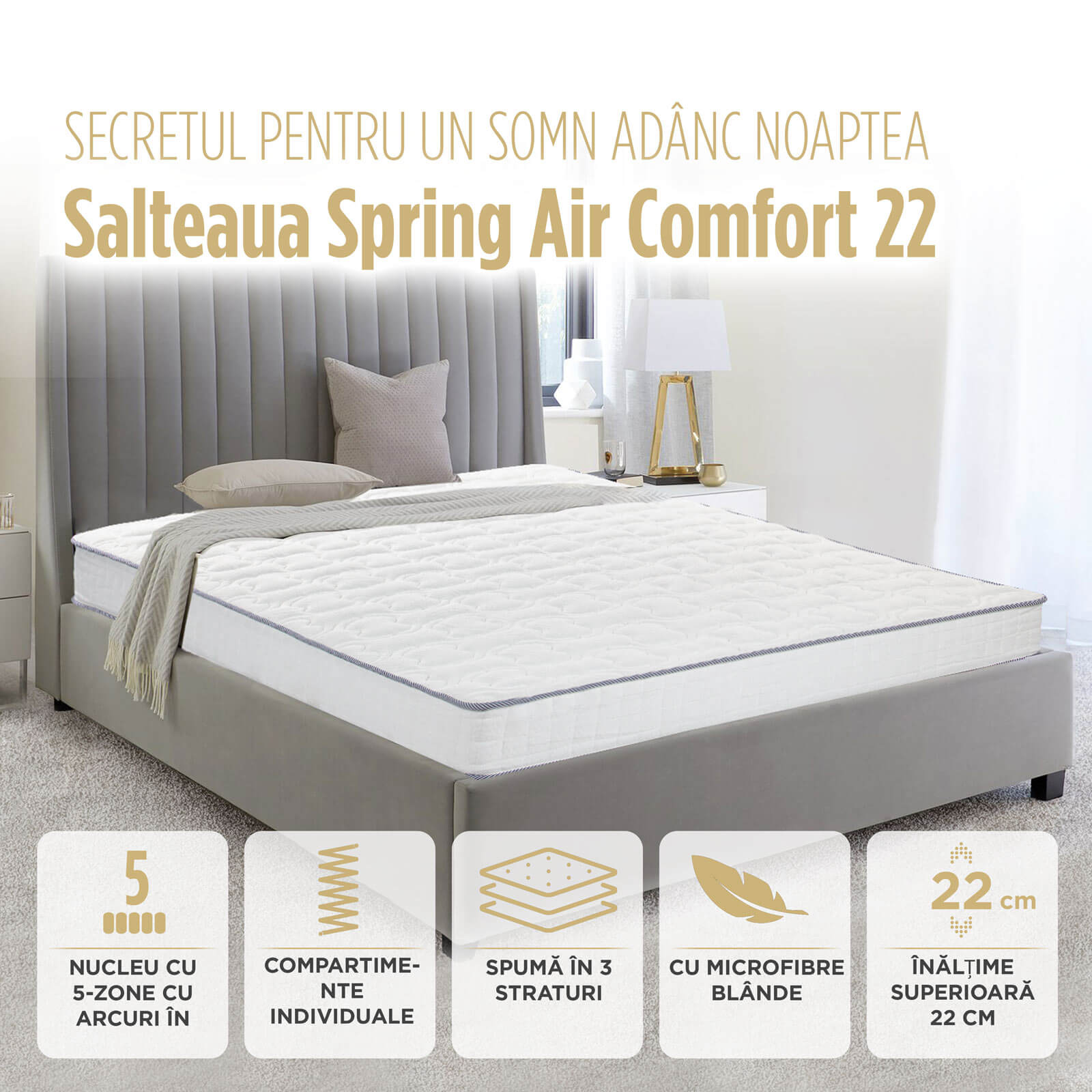 - Spring Air este alegerea ideală pentru cei care își doresc un somn profund și liniștit. Compartimentele avansate atenuează eficient mișcările și zgomotele produse în timpul somnului, oferind un confort sporit chiar și atunci când partenerul se mișcă. Este o opțiune excelentă pentru paturile duble și pentru nopți fără întreruperi.