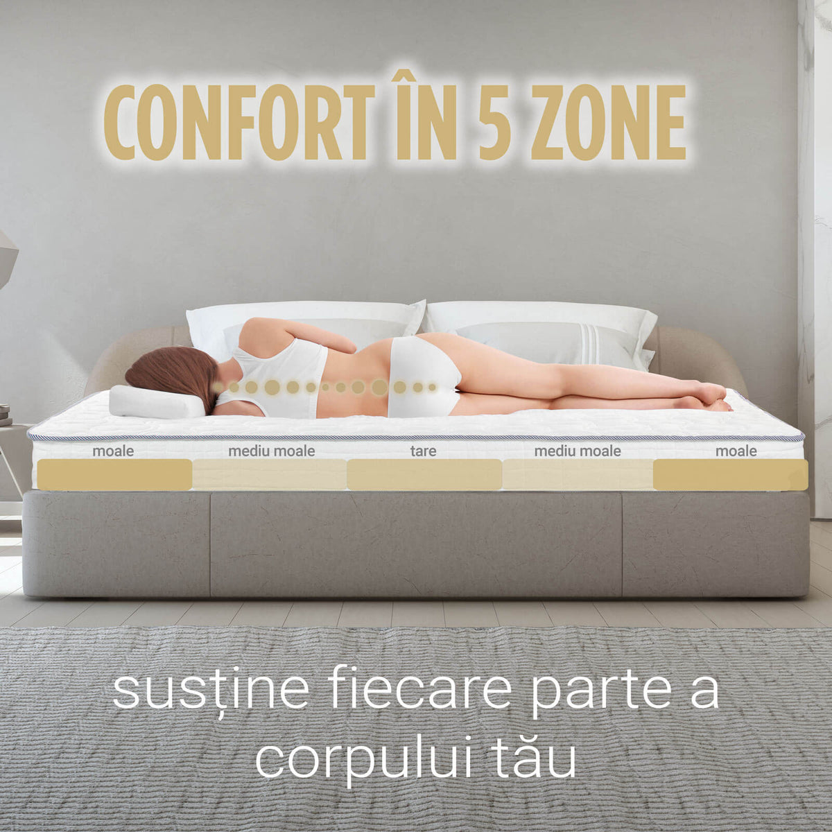 - Structura cu 5 zone de confort oferă sprijin optim pentru cap, umeri, spate, șolduri și picioare.