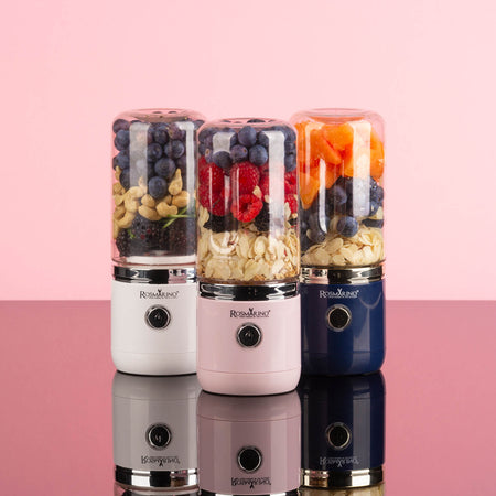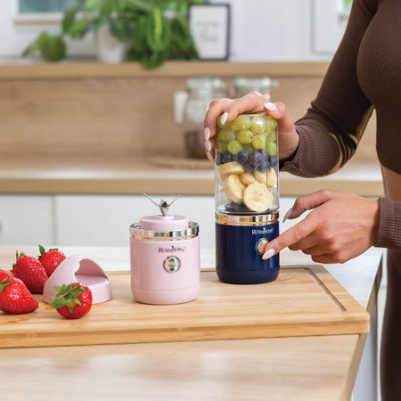 Blenderul portabil include un pahar fără BPA, în care poți pune fructele, legumele și lichidele preferate. Apasă butonul, amestecă și pune capacul pentru a lua băuturile cu tine oriunde. Blenderul Rosmarino NutriMax 2 GO este de mare ajutor când ai nevoie de o masă sau o gustare sănătoasă în deplasare.