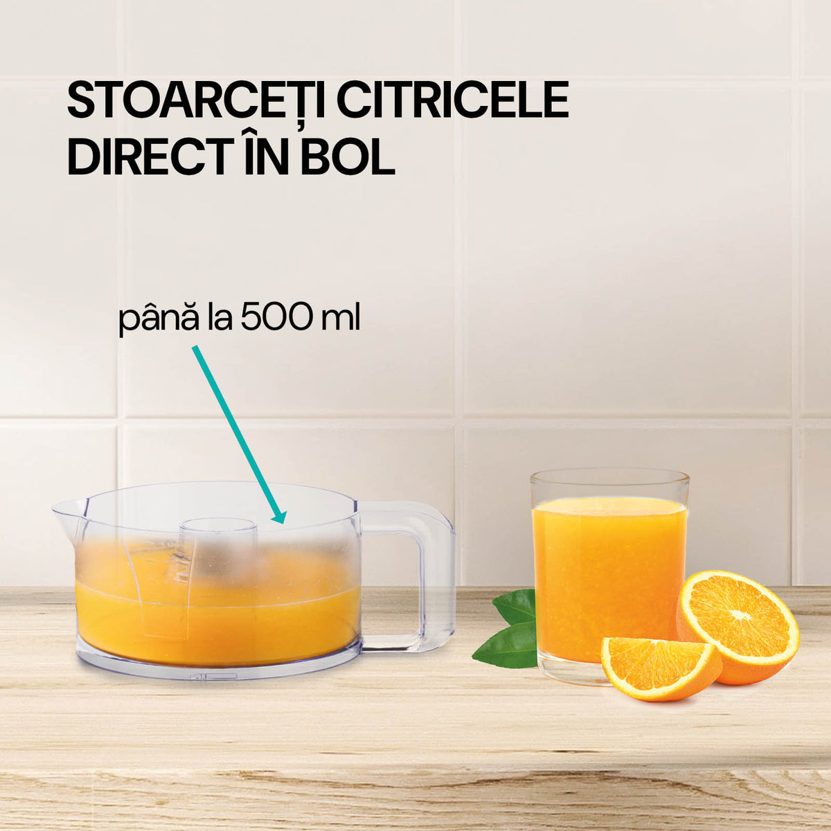 - Poți stoarce sucul natural direct în cană (500 ml).