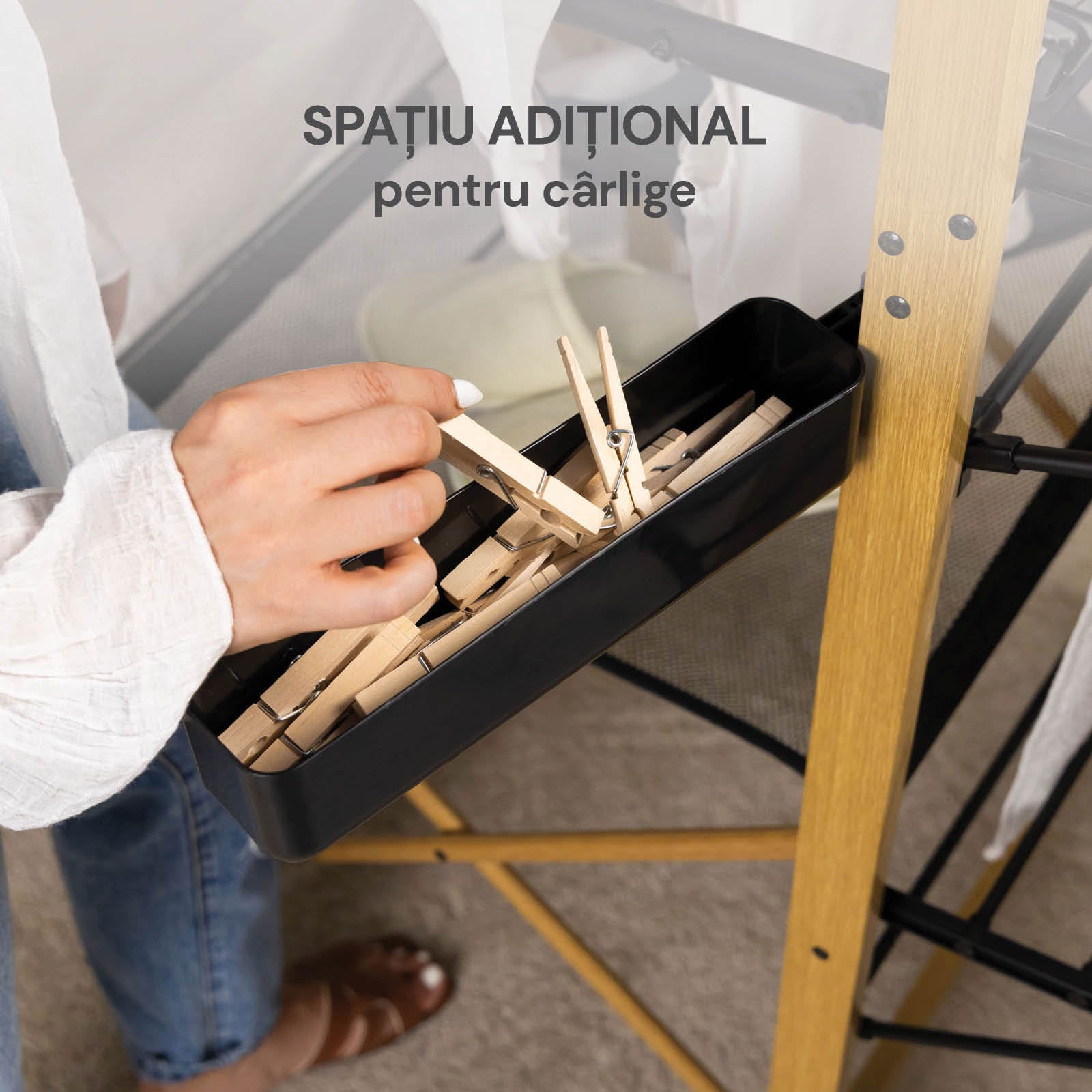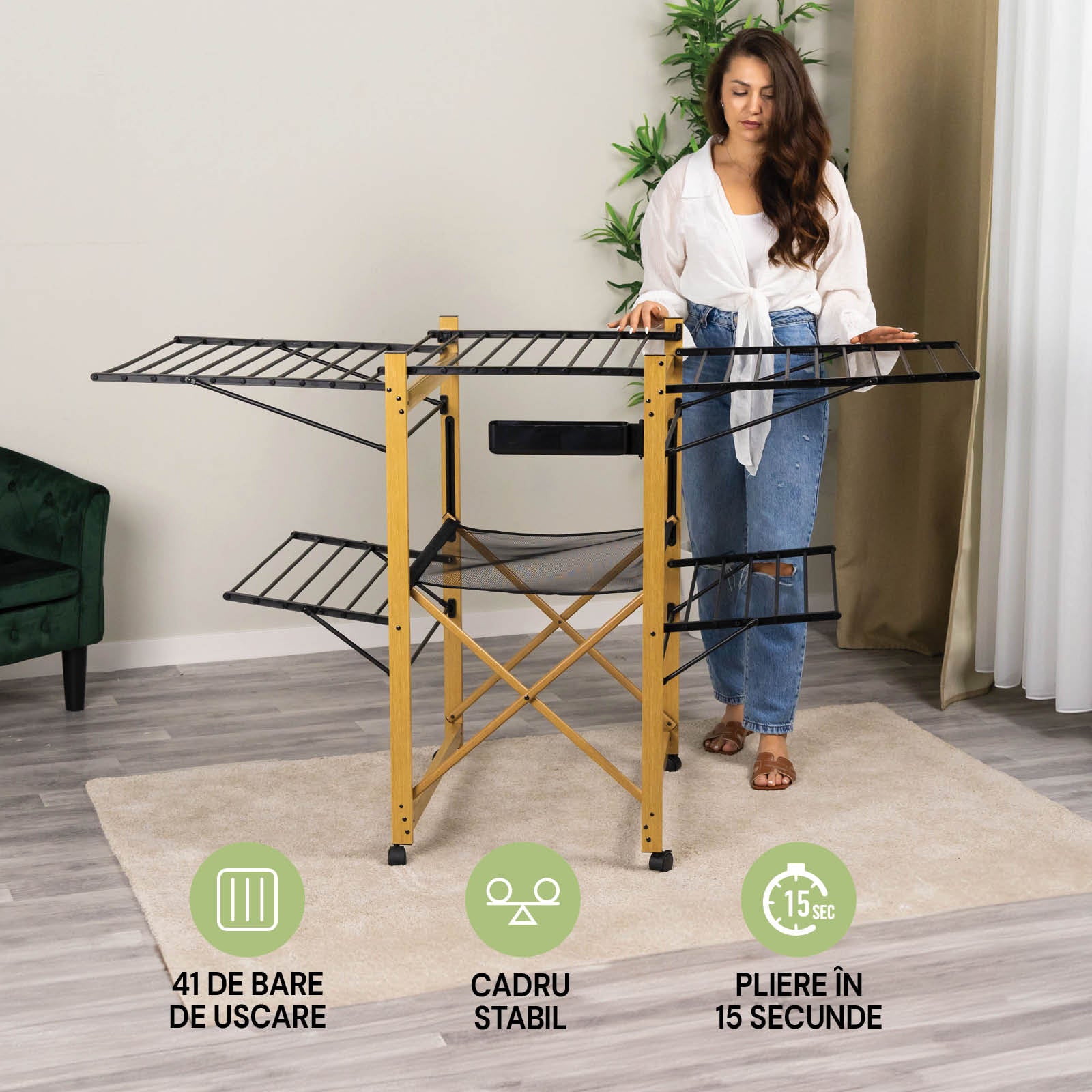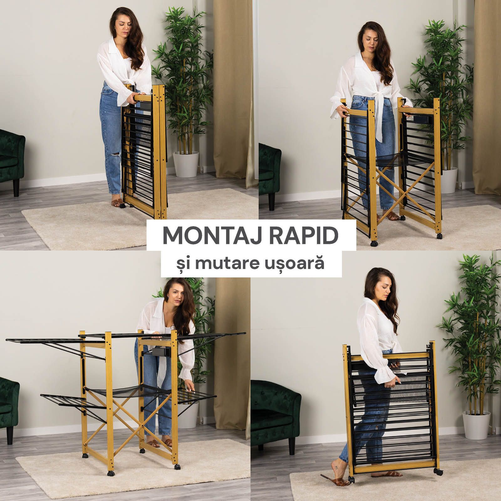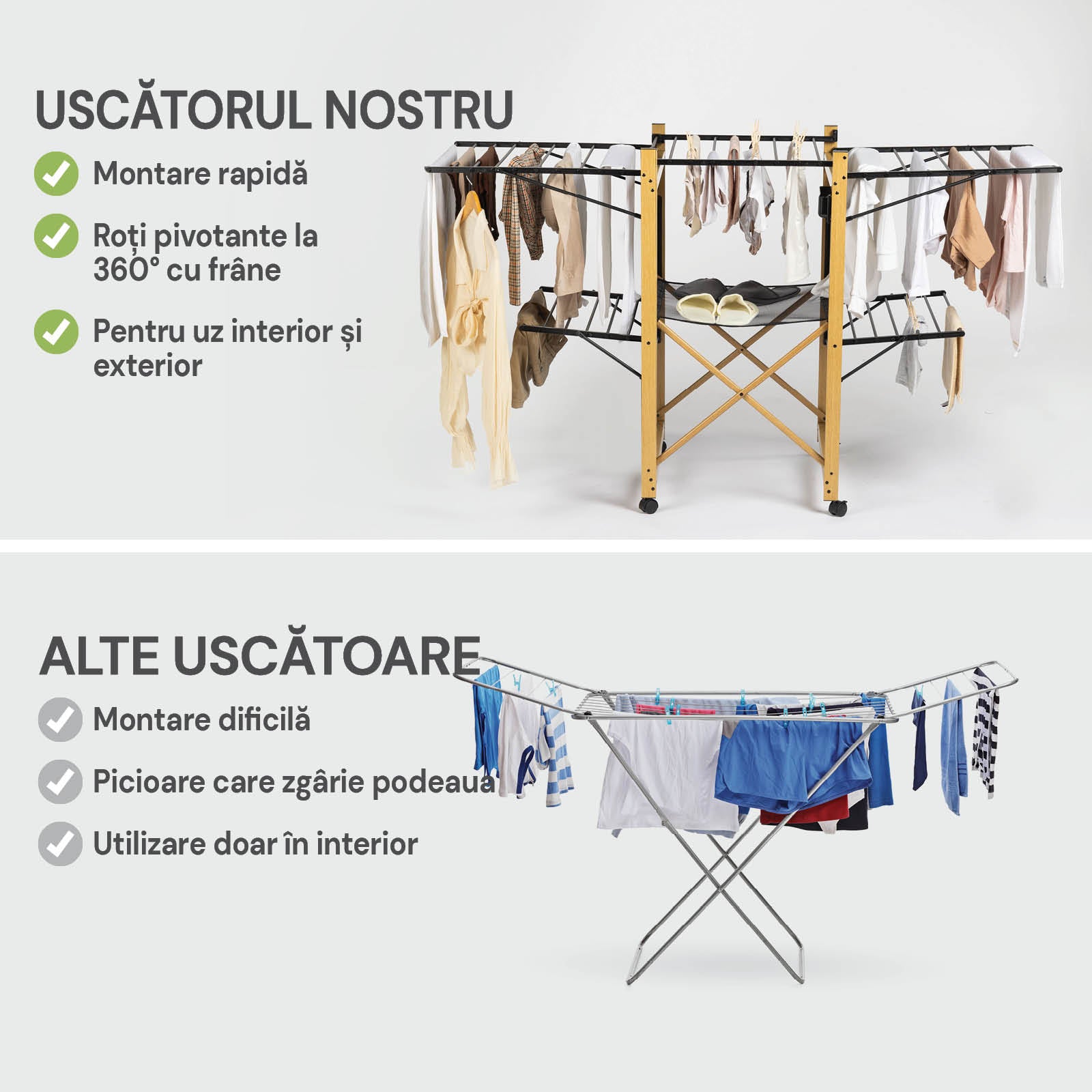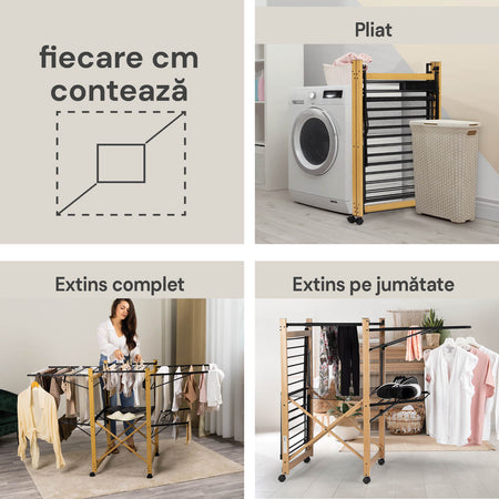 - Uscător pliabil modern ce oferă mai mult spațiu decât opțiunile tradiționale.