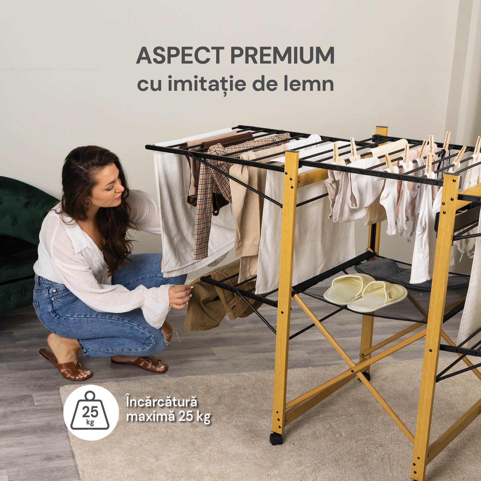 - Uscător stabil cu imitație de lemn pentru utilizare în interior și exterior.
