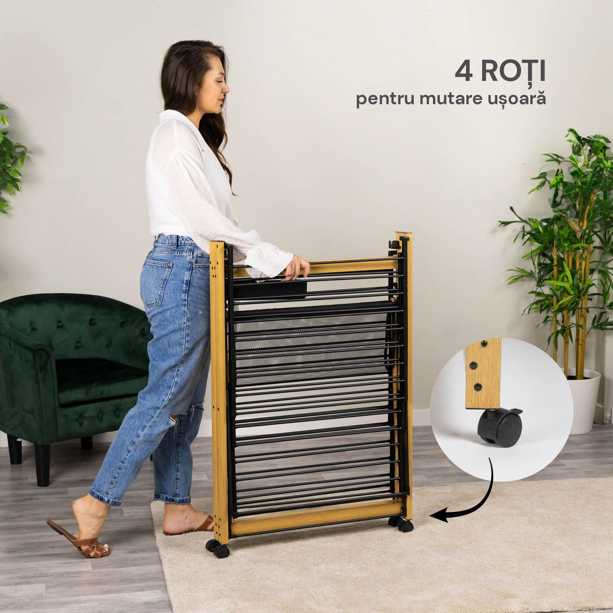 - 4 roți care se mișcă în toate direcțiile pentru mutarea rapidă a uscătorului.