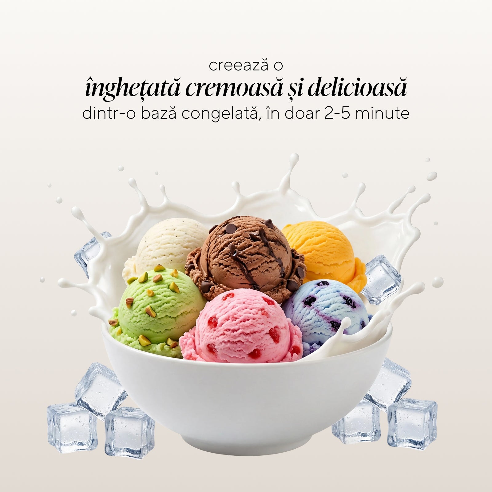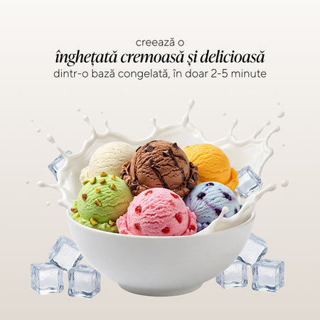 - Preparare extrem de rapidă – transformă baza congelată într-o înghețată cremoasă în doar 2 până la 5 minute