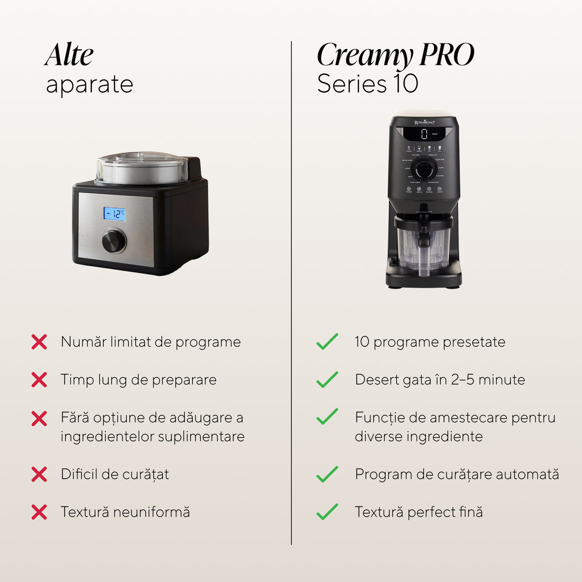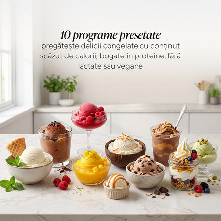 - Control deplin asupra ingredientelor – prepari deserturi congelate cu puține calorii, bogate în proteine, fără lactoză sau vegane