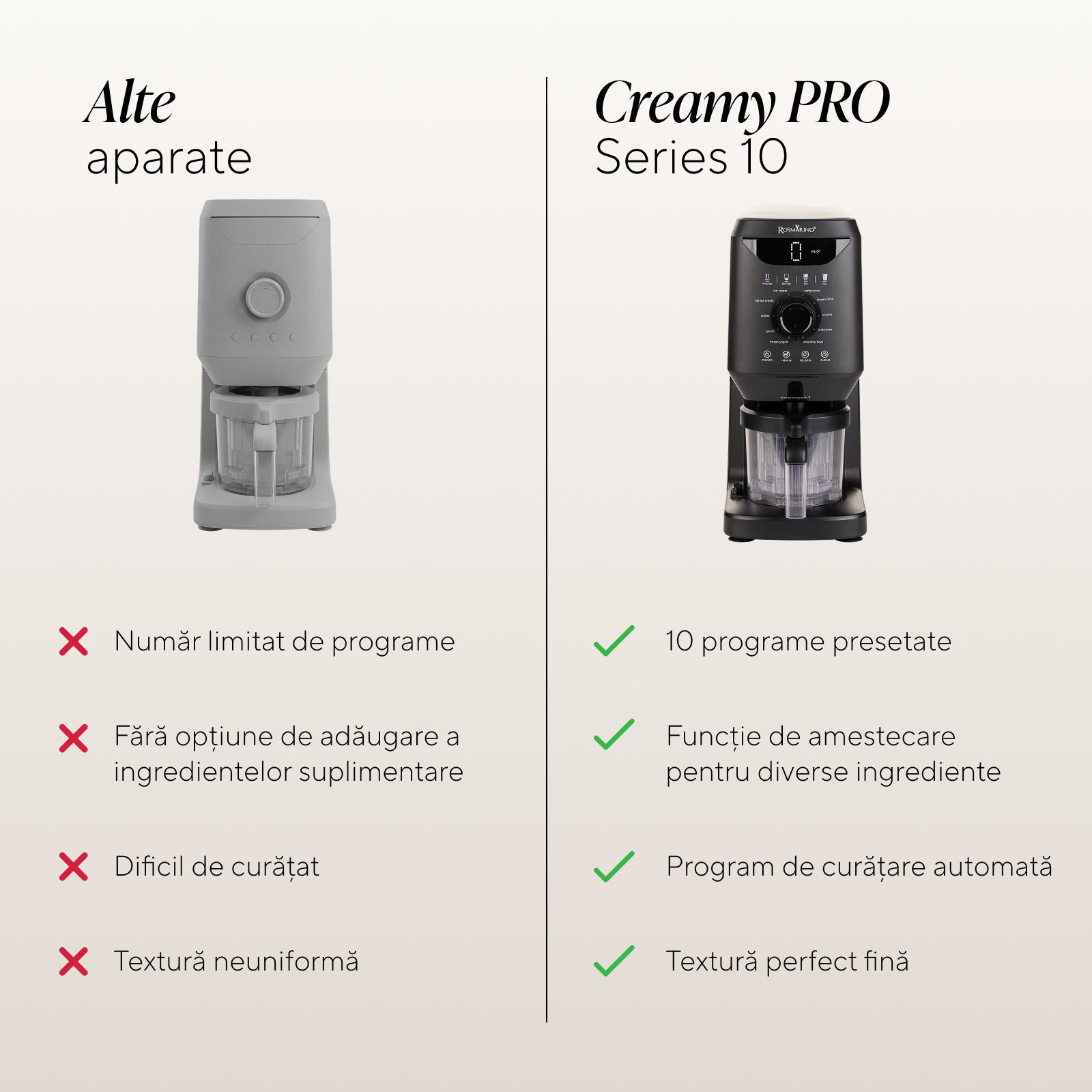 - Motorul puternic de 800 W creează o textură uniformă, cremoasă, fără cristale de gheață