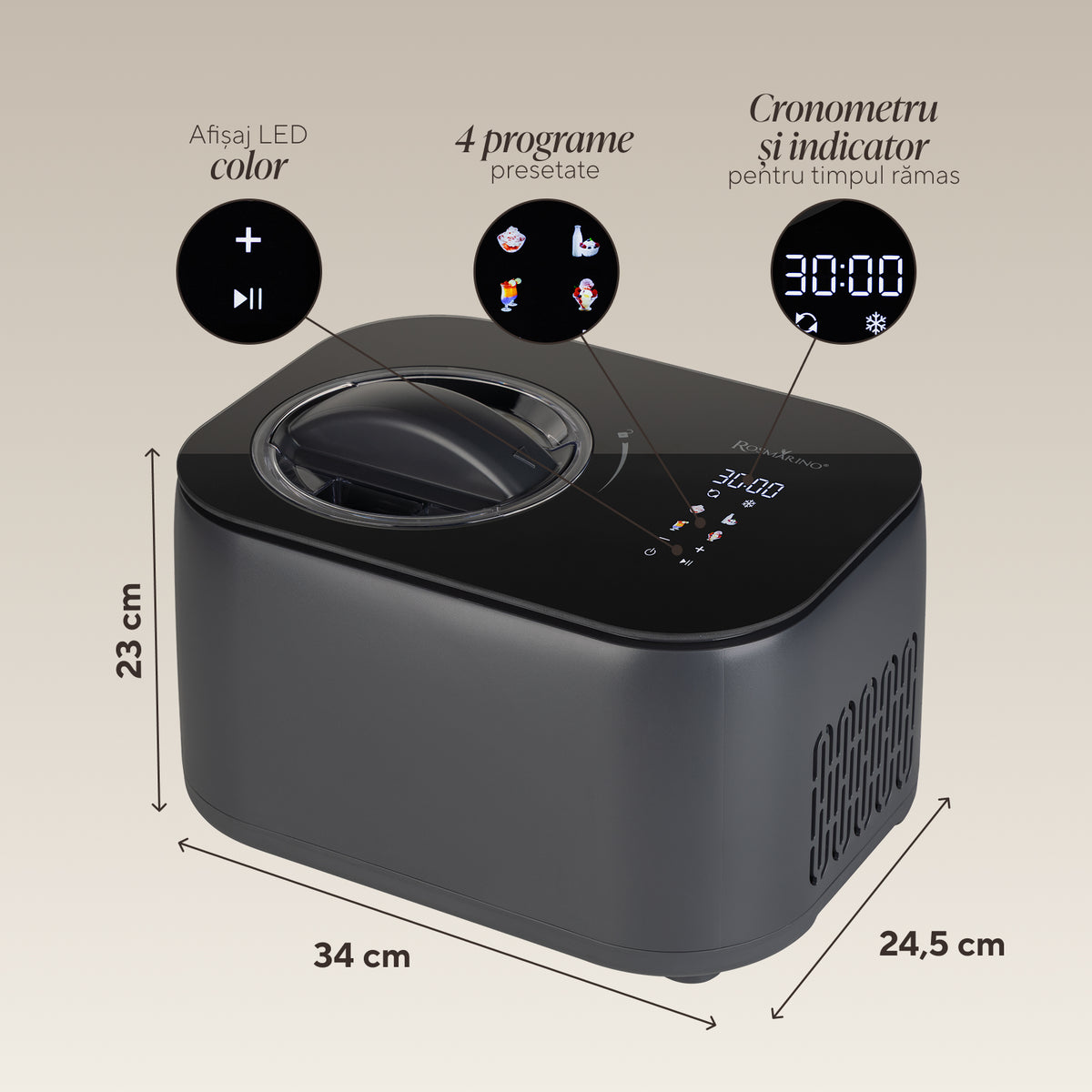 - 4 programe presetate – gelato italian, sorbet, iaurt congelat, slushie