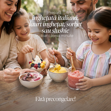 - Control complet asupra ingredientelor – prepari deserturi congelate hipocalorice, bogate în proteine, fără lactate sau vegane
