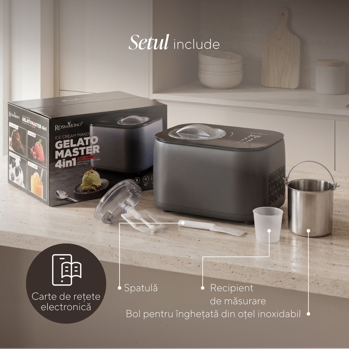 - Accesorii incluse: bol de înghețată din inox, spatulă, pahar gradat și carte electronică cu rețete